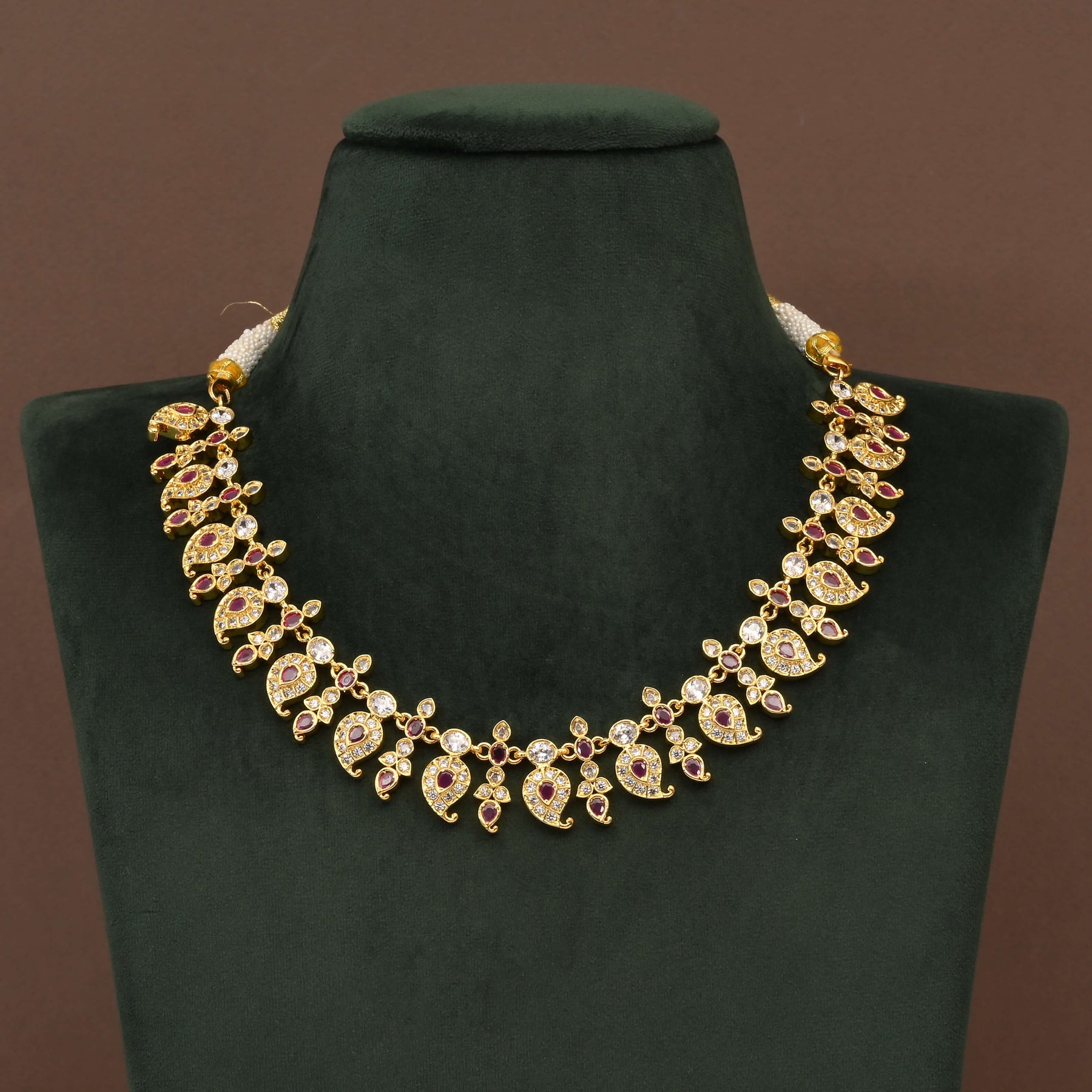 Elevate your traditional wardrobe with this exquisite Temple Necklace Set, crafted in lustrous gold finish. Each piece showcases authentic mango and nakshi styling, hallmarks of classical Indian jewelry design. Handcrafted with meticulous attention to detail, this one-of-a-kind set captures the essence of temple jewelry with its intricate workmanship. Perfect for festive occasions, weddings, or cultural celebrations, it brings timeless elegance and spiritual significance to your collection. A true artisan creation that honors heritage craftsmanship.