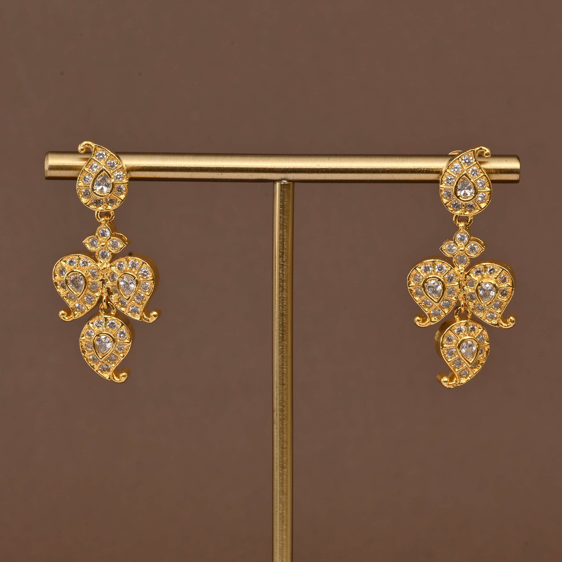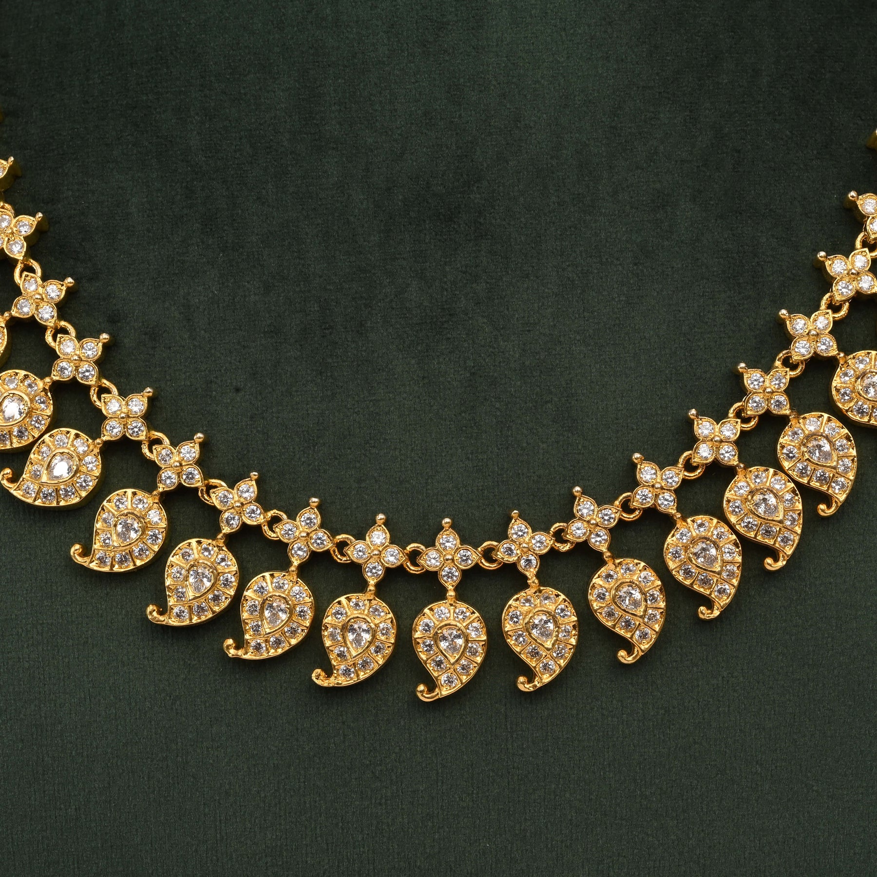 Discover timeless elegance with this handcrafted Temple Necklace Set, showcasing authentic nakshi artistry and a striking mango motif. Adorned with brilliant CZ stones that capture light beautifully, this piece combines traditional design with contemporary sparkle. The gold finish provides a luxurious appearance while the meticulous handcraftsmanship ensures each set is truly one-of-a-kind. Ideal for weddings, festivals, and special occasions, this necklace honors classical temple jewelry heritage with refined sophistication and enduring appeal.