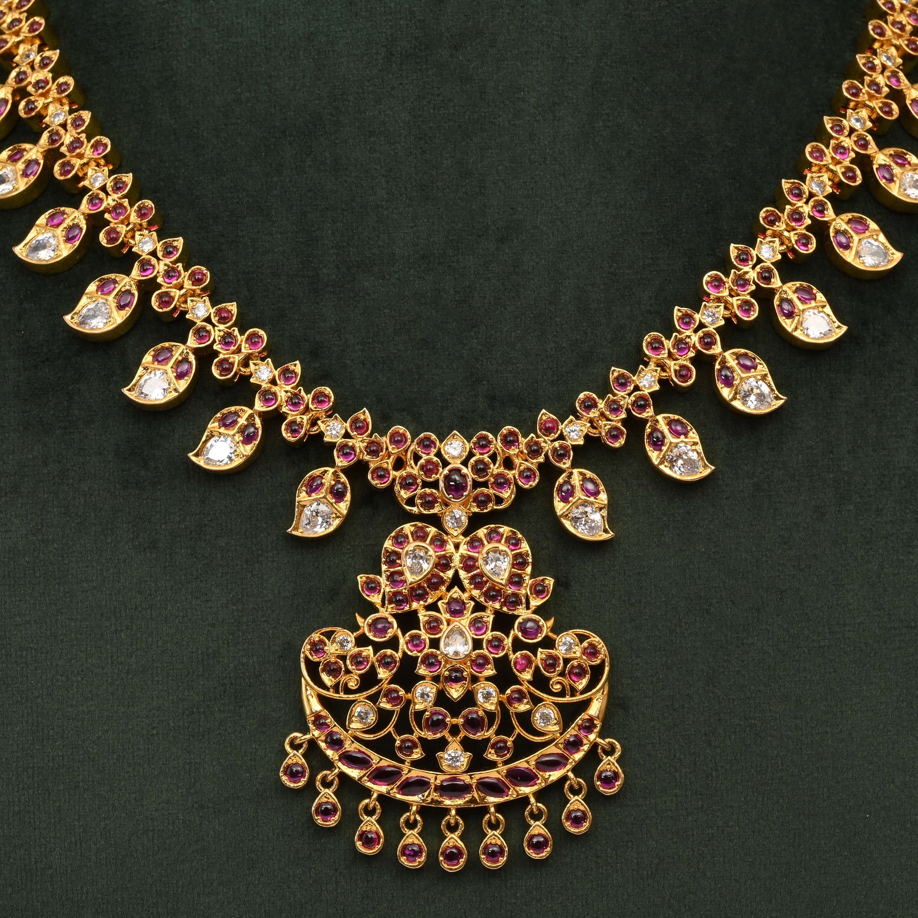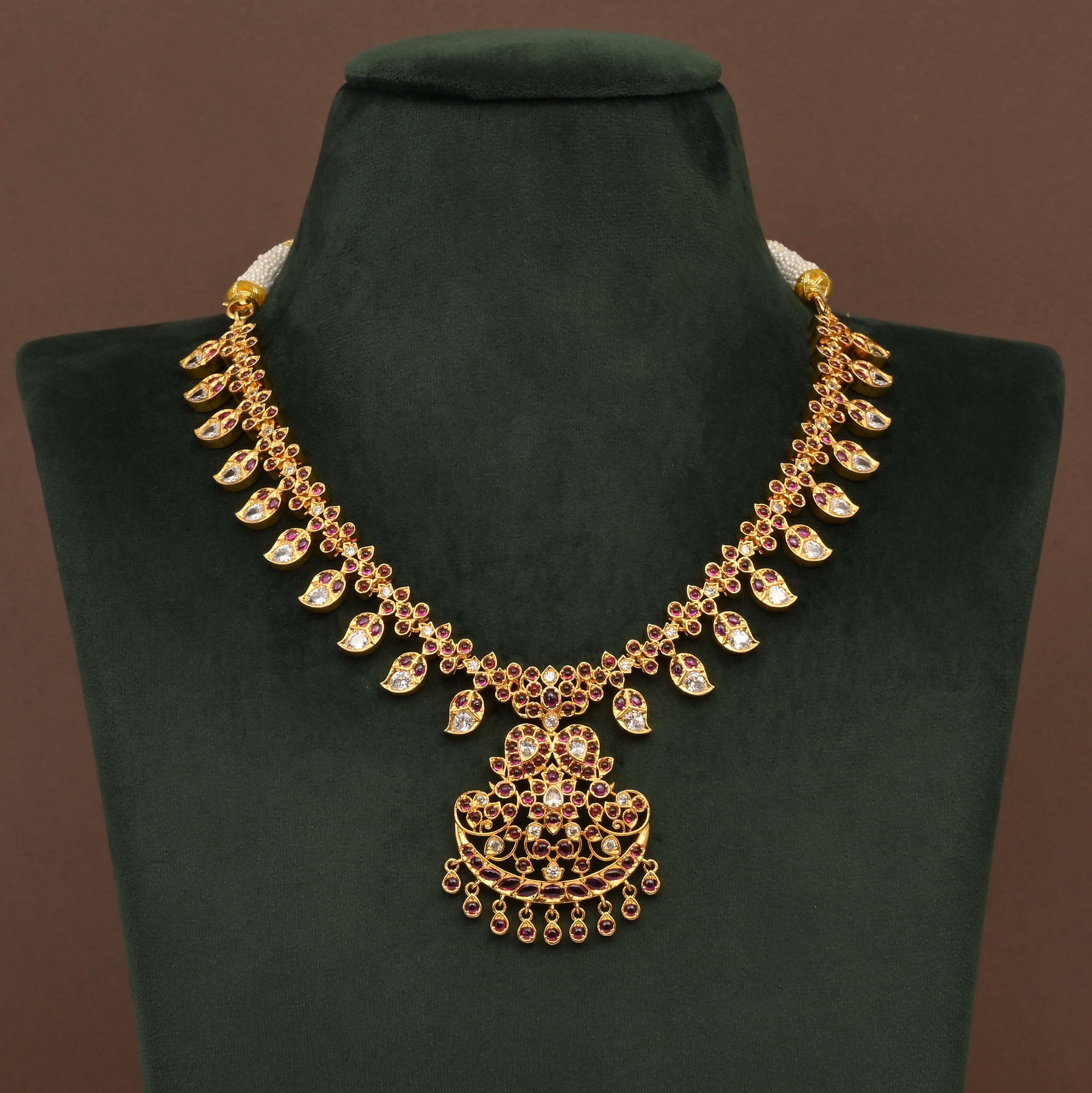 Elevate your traditional wardrobe with this exquisite Temple Necklace Set, crafted in a lustrous gold finish that captures timeless elegance. Each piece showcases authentic nakshi artistry—intricate hand-carved detailing that reflects centuries of jewelry-making heritage. This one-of-a-kind handcrafted set combines meticulous craftsmanship with spiritual aesthetics, making it an ideal choice for festivals, celebrations, or everyday wear. The temple-inspired design features ornate patterns characteristic of South Indian jewelry traditions, ensuring you own a truly unique treasure that celebrates cultural artistry and exceptional quality.
