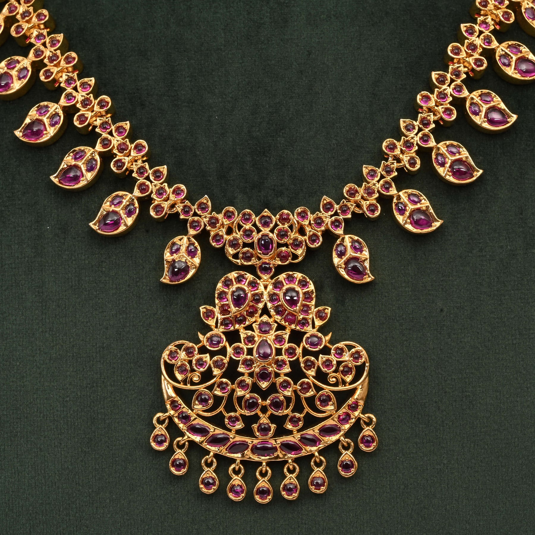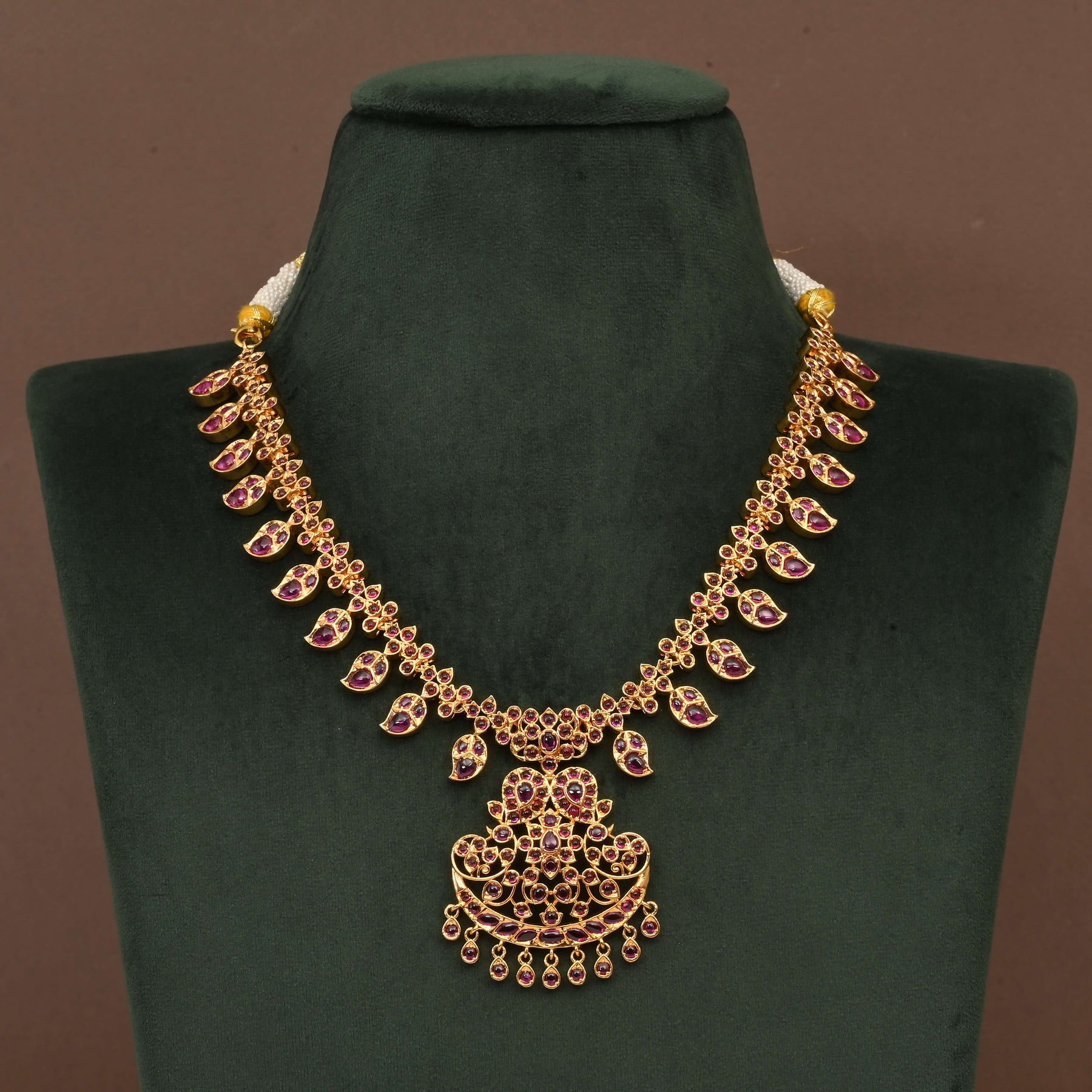 Elevate your traditional ensemble with this exquisite Temple Necklace Set, crafted in lustrous gold finish. Each piece showcases authentic nakshi artistry—intricate hand-carved detailing that reflects centuries of jewelry-making heritage. The meticulous handcrafted construction ensures every necklace is genuinely one of a kind, bearing the unique character of artisanal work. Perfect for festivals, celebrations, or adding timeless elegance to your collection, this set captures the essence of classical temple jewelry with contemporary wearability.