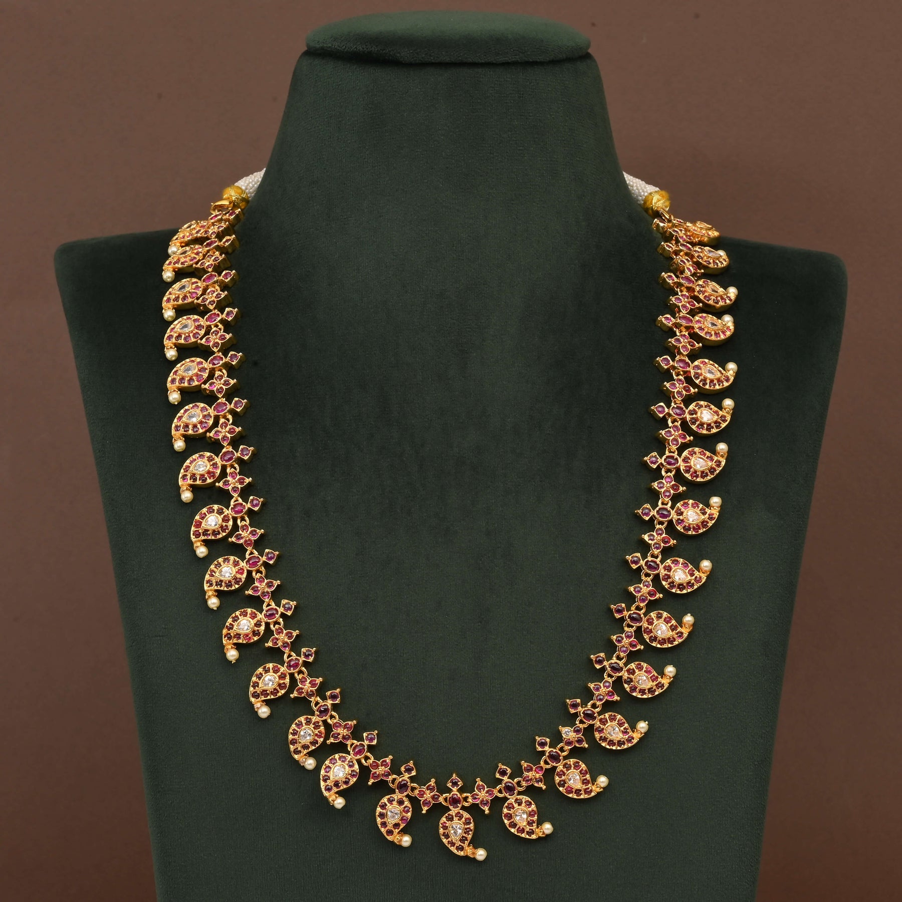 Elevate your traditional ensemble with this exquisite Temple Necklace Set, a masterpiece of authentic craftsmanship. Featuring an intricate mango design rendered in nakshi style, this handcrafted piece showcases the timeless elegance of temple jewelry. Each necklace is meticulously created with a lustrous gold finish, capturing the richness of traditional artistry. The one-of-a-kind nature of this set ensures you possess a truly unique heirloom-quality piece that honors centuries of jewelry-making heritage. Perfect for festive occasions, weddings, or adding cultural sophistication to your collection.