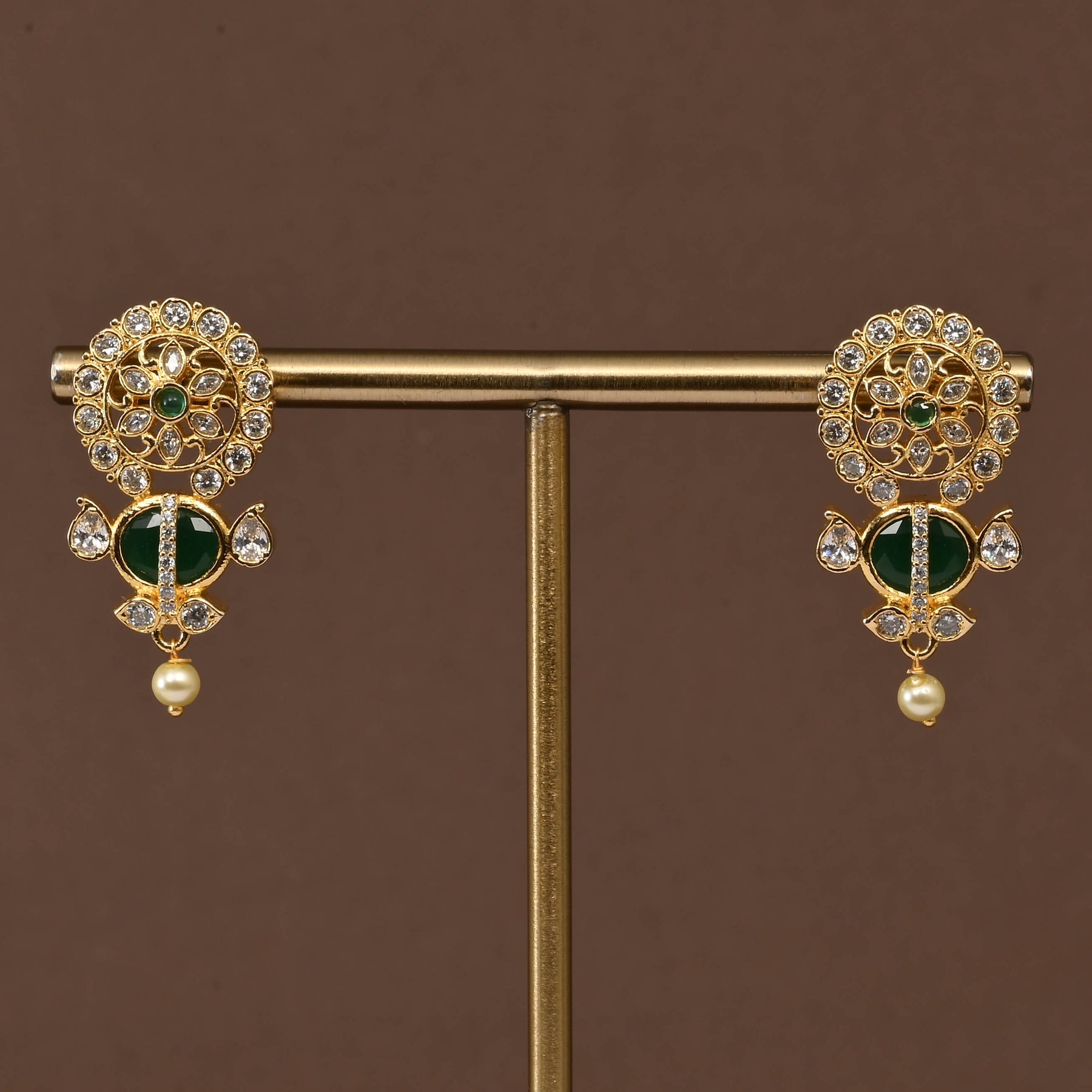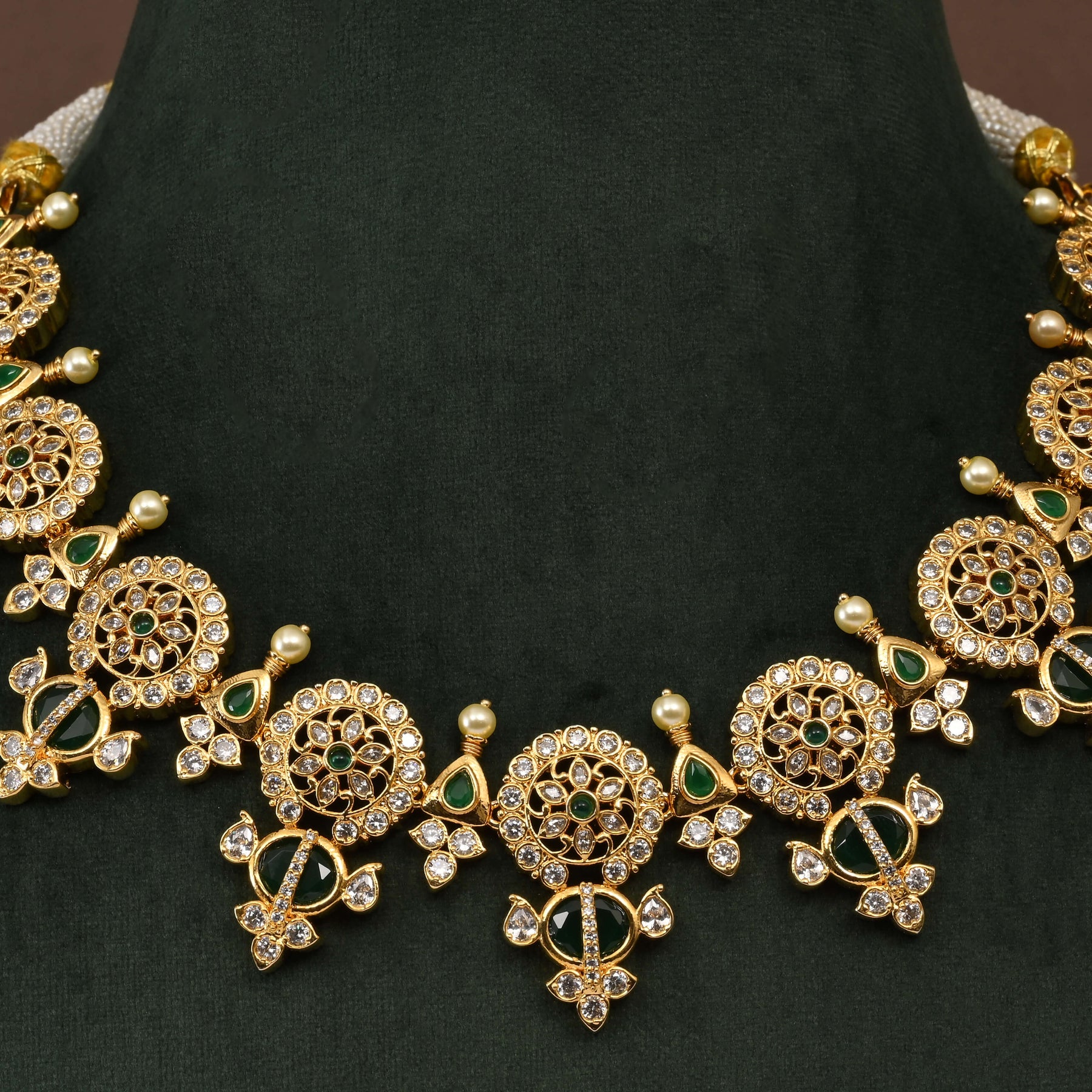 Elevate your traditional ensemble with this exquisite Temple Necklace Set, crafted in lustrous gold finish. Each piece showcases authentic nakshi artistry—intricate hand-carved detailing that reflects centuries of jewelry-making heritage. The traditional design features ornamental temple motifs, making it an ideal choice for festivals, weddings, and special occasions. As a handcrafted creation, every set is uniquely individual, bearing the distinctive character of skilled artisanal work. This one-of-a-kind piece seamlessly blends timeless elegance with contemporary wearability, perfect for those who appreciate authentic craftsmanship and cultural significance.