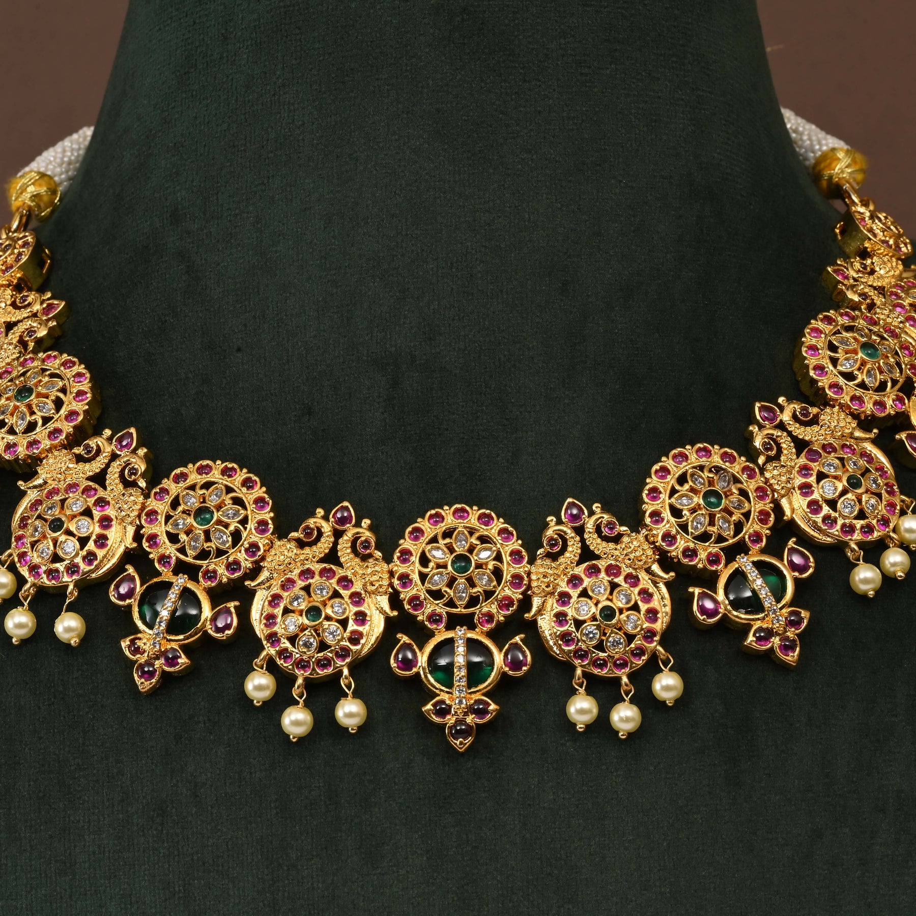 Elevate your traditional ensemble with this exquisite Temple Necklace Set, crafted in a lustrous gold finish that captures timeless elegance. Each piece showcases authentic nakshi artistry—intricate hand-carved detailing that reflects centuries of jewelry-making heritage. This one-of-a-kind handcrafted creation combines meticulous craftsmanship with spiritual aesthetics, making it an ideal choice for festivals, weddings, and special occasions. The set's traditional design ensures versatility across various cultural celebrations while maintaining its distinctive character. A treasured investment for those who appreciate authentic, artisanal jewelry with profound cultural significance.