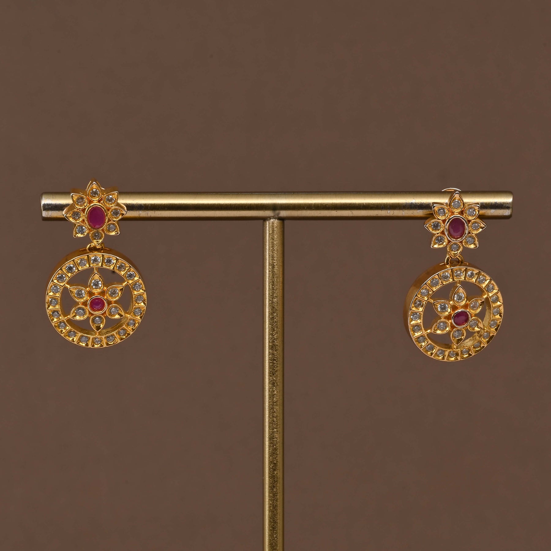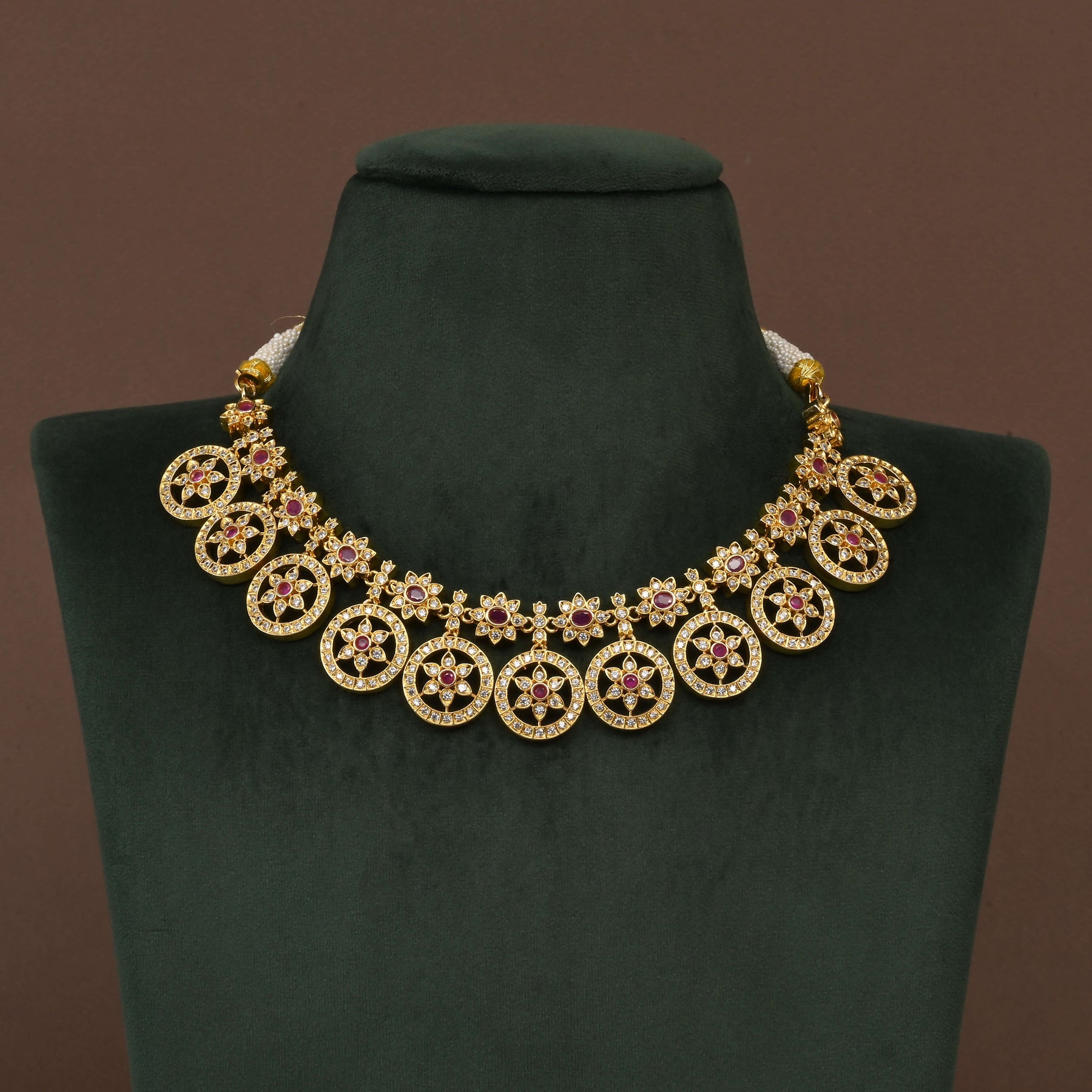 Discover timeless elegance with this handcrafted Temple Necklace Set, featuring authentic nakshi artistry in a radiant gold finish. Adorned with brilliant CZ stones that sparkle with diamond-like brilliance, each piece showcases traditional temple design executed with meticulous precision. Crafted by skilled artisans using time-honored techniques, this one-of-a-kind set combines classical aesthetics with contemporary sparkle. Ideal for festive occasions, weddings, or adding refined sophistication to your collection. An heirloom-quality piece that honors traditional craftsmanship while delivering lasting radiance and beauty.
