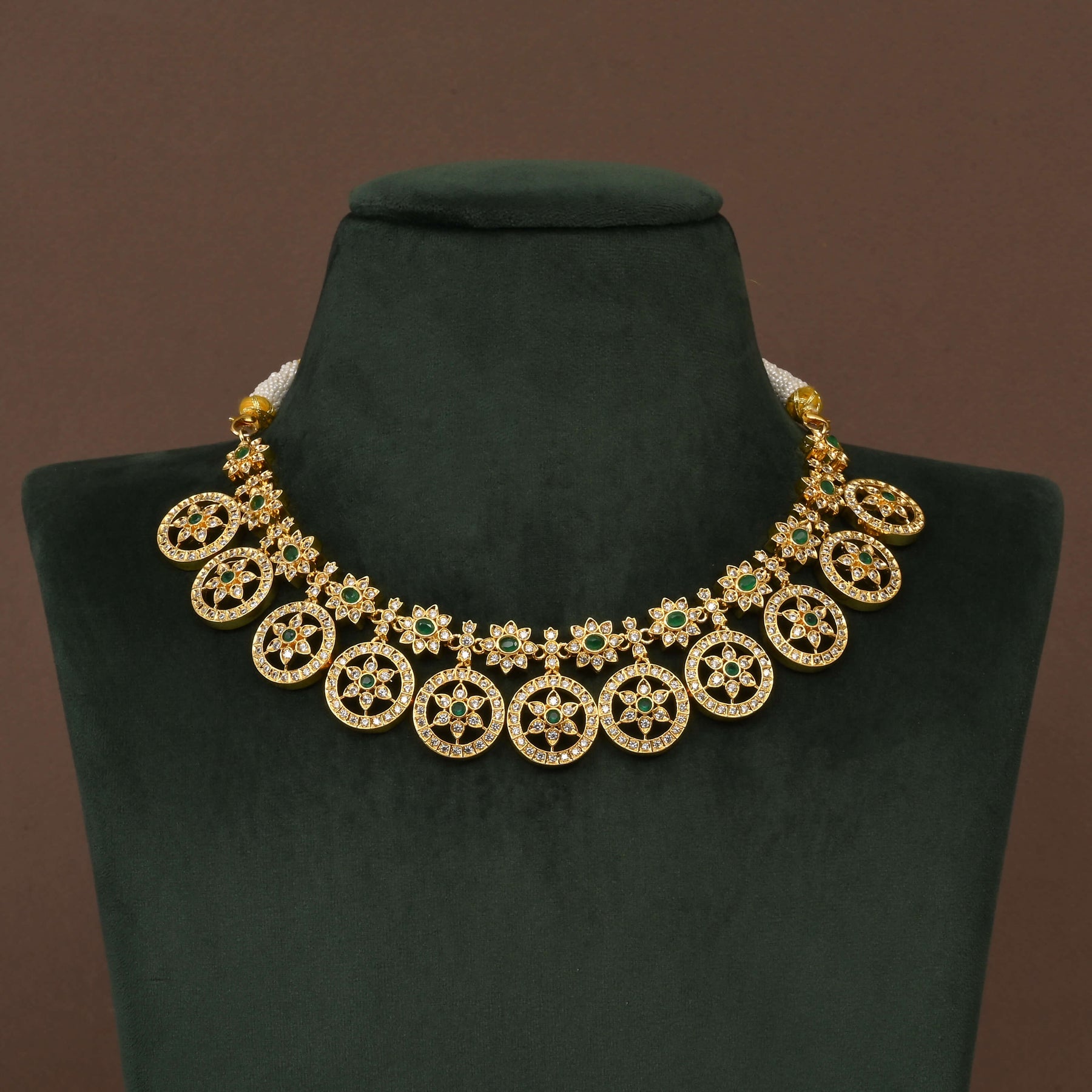 Elevate your traditional ensemble with this exquisite Temple Necklace Set, a masterpiece of handcrafted artistry. Featuring authentic nakshi detailing and radiant realm CZ stones that capture light beautifully, this gold-finish piece embodies timeless elegance. Each design is meticulously created by skilled artisans, making every set truly one of a kind. Perfect for festivals, celebrations, or special occasions, this necklace seamlessly blends heritage craftsmanship with contemporary sophistication. A treasured addition to any jewellery collection.