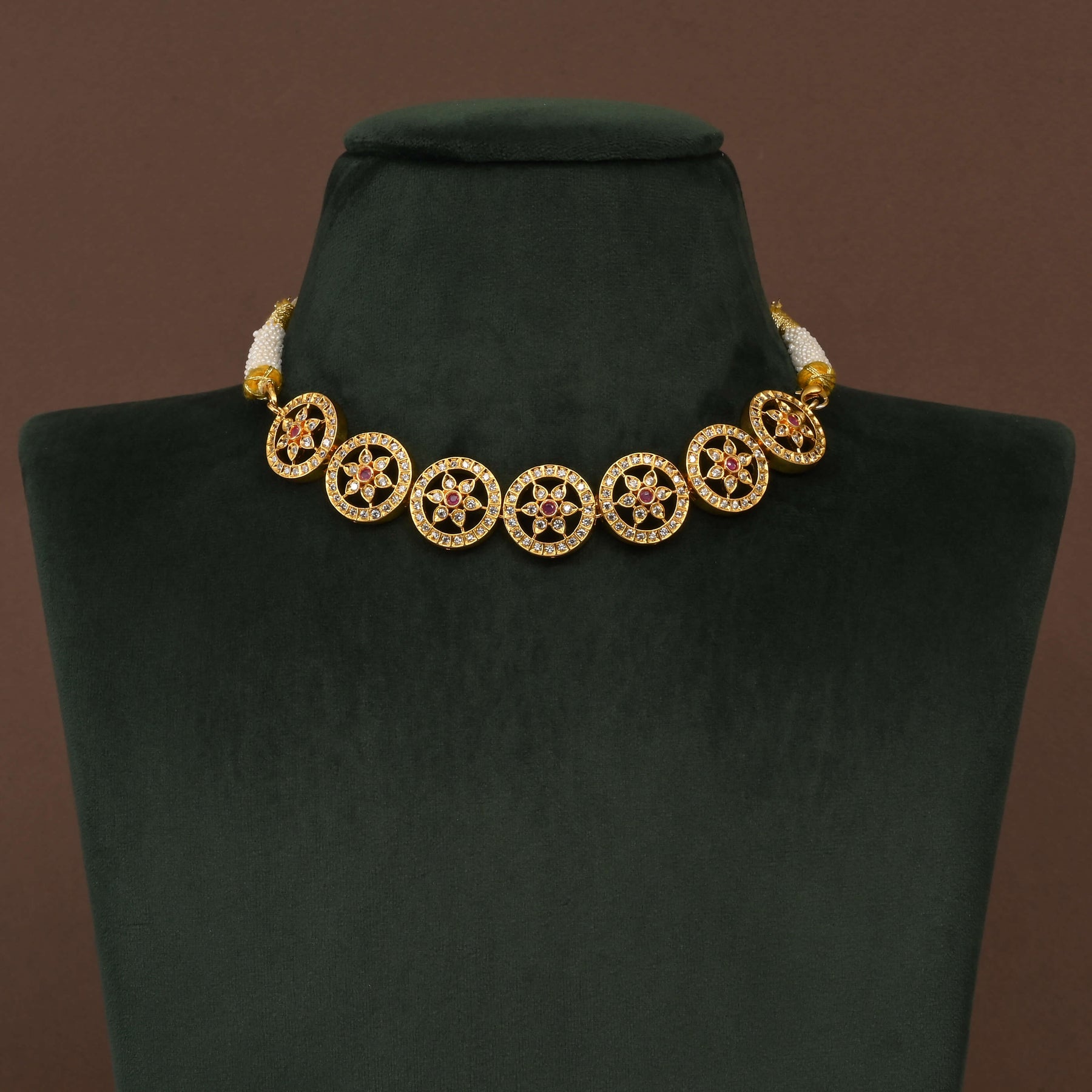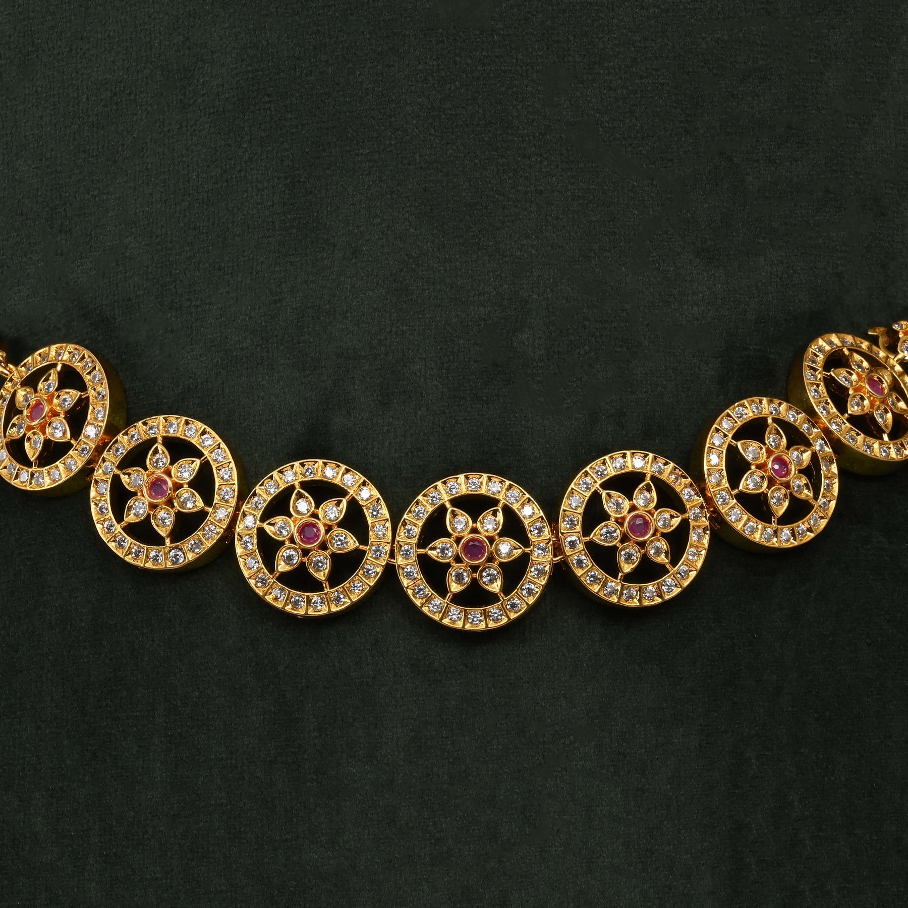 Elevate your traditional ensemble with this exquisite Temple Necklace Set, a masterpiece of handcrafted artistry. Featuring authentic nakshi detailing and a lustrous gold finish, this one-of-a-kind piece captures the essence of temple jewelry craftsmanship. Adorned with brilliant CZ stones that sparkle with genuine radiance, each element is meticulously designed to reflect timeless elegance. Perfect for festive occasions, weddings, or cultural celebrations, this necklace set combines heritage aesthetics with contemporary brilliance, making it an heirloom-worthy addition to your jewelry collection.