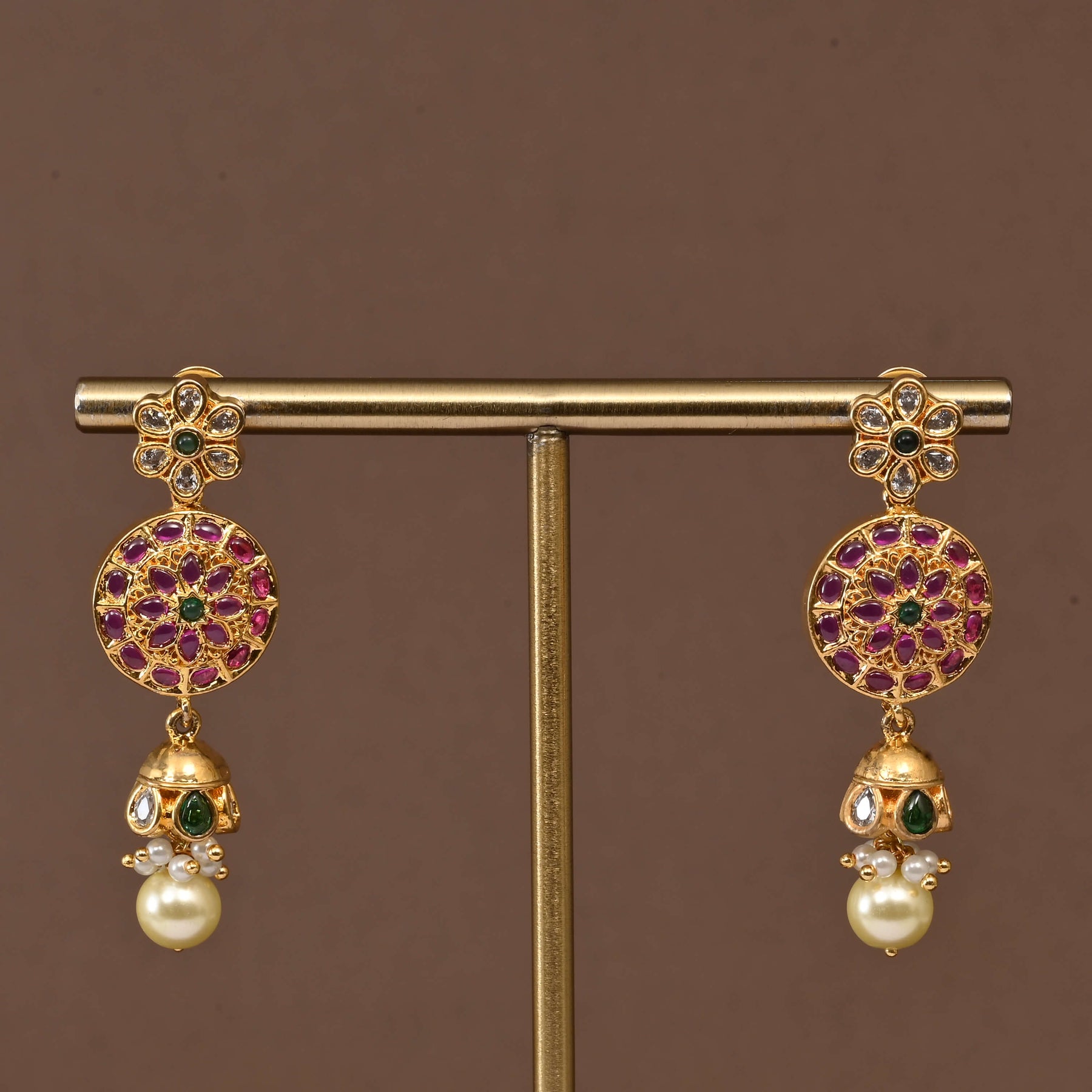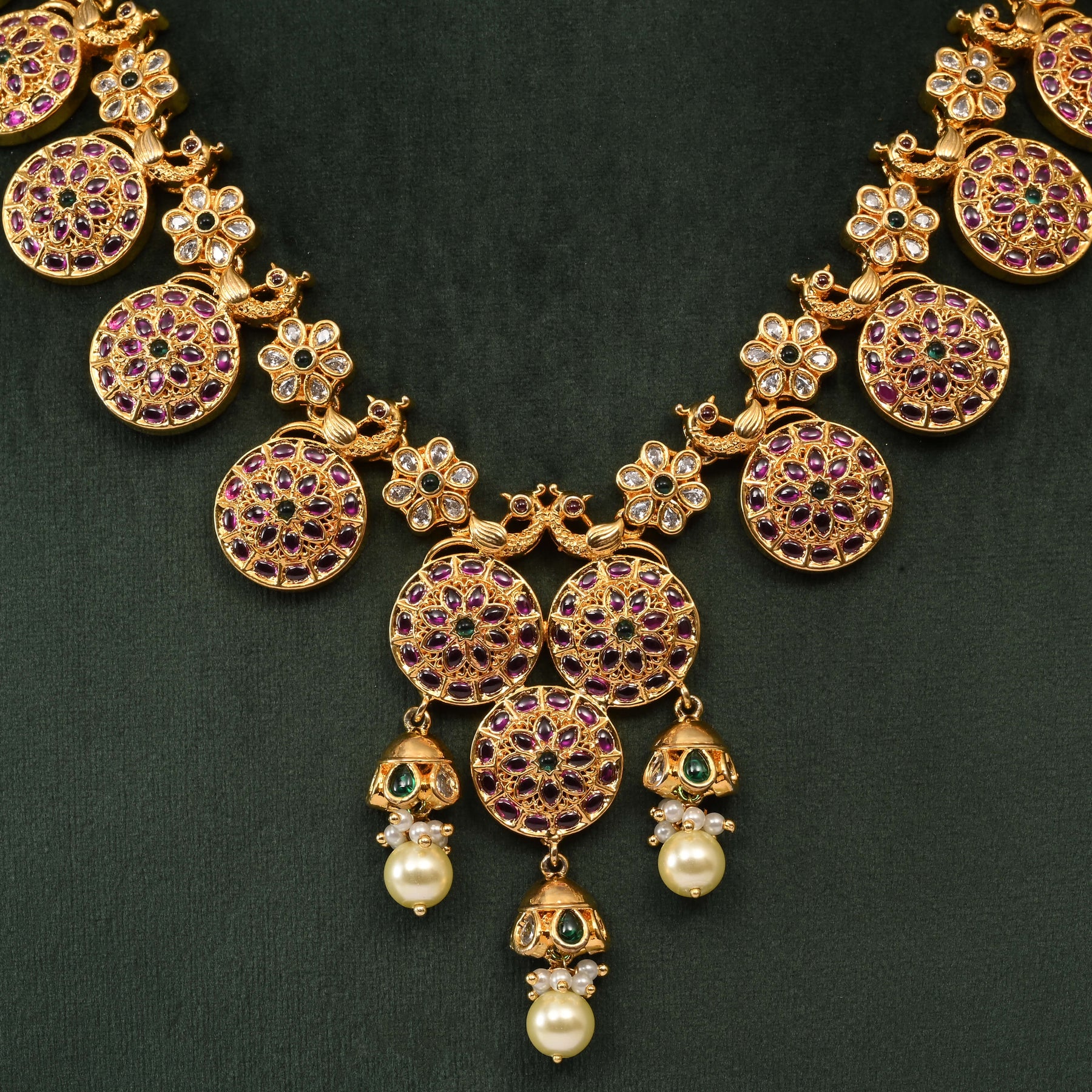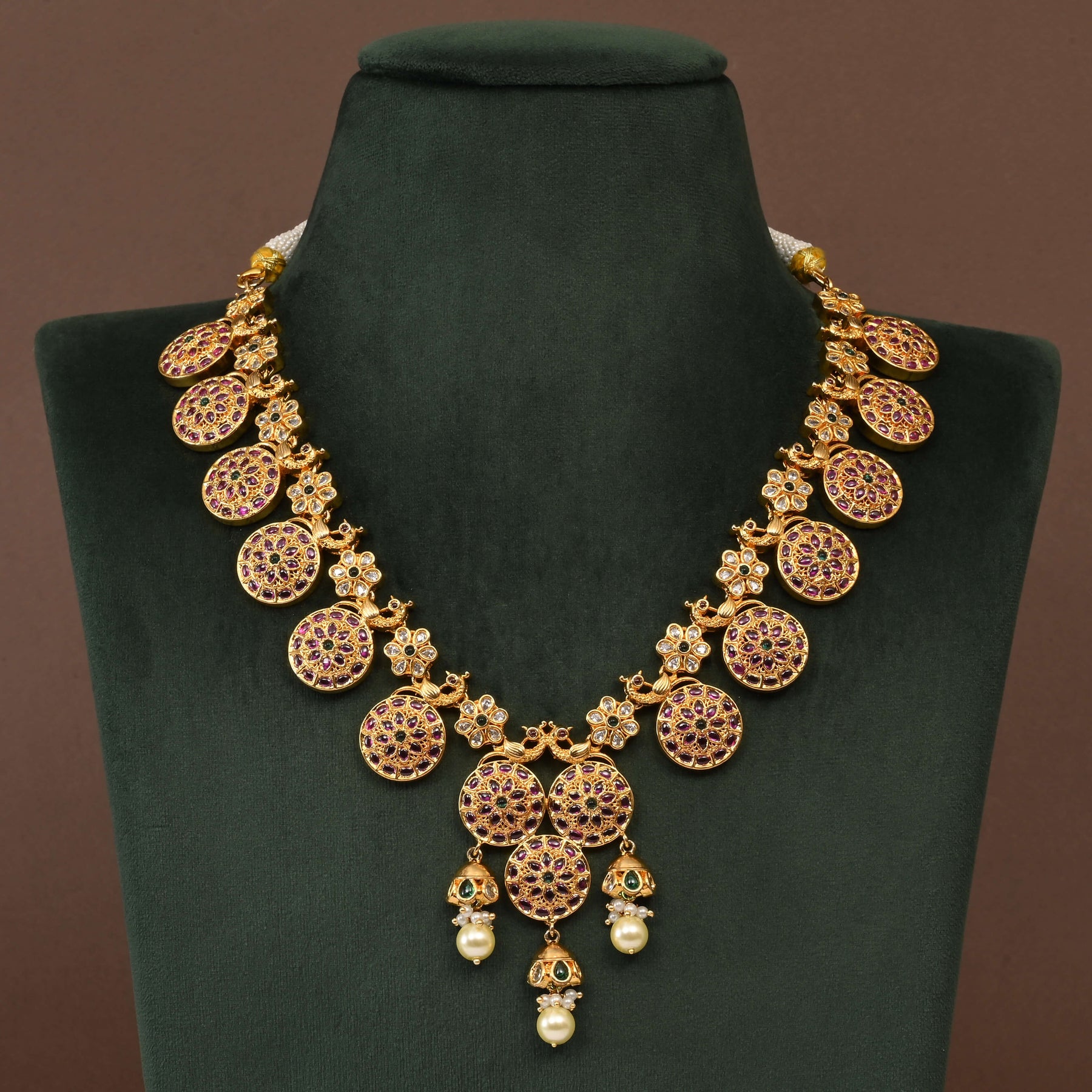 Elevate your traditional wardrobe with this exquisite Temple Necklace Set, crafted in lustrous gold finish. Each piece showcases authentic nakshi artistry—intricate hand-carved detailing that reflects centuries of jewelry-making heritage. The traditional design features ornamental temple motifs, making it an ideal choice for festivals, weddings, and special occasions. Handcrafted with meticulous attention to detail, this one-of-a-kind set combines timeless elegance with artisanal craftsmanship. A statement piece that honors cultural aesthetics while adding sophisticated glamour to any ensemble.