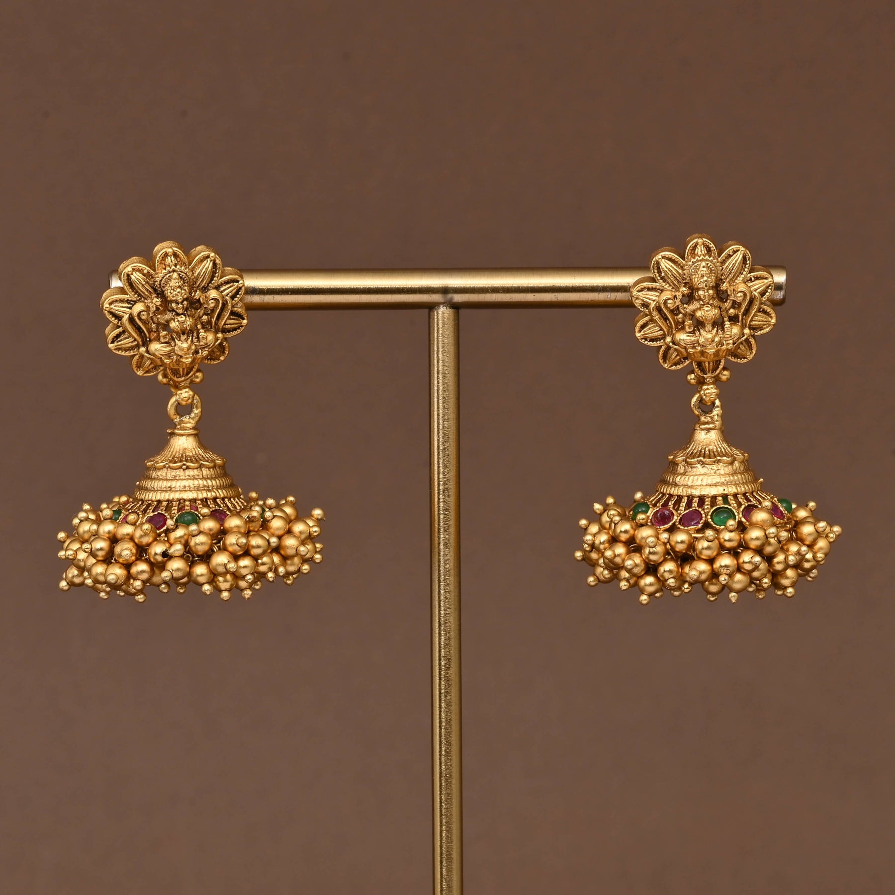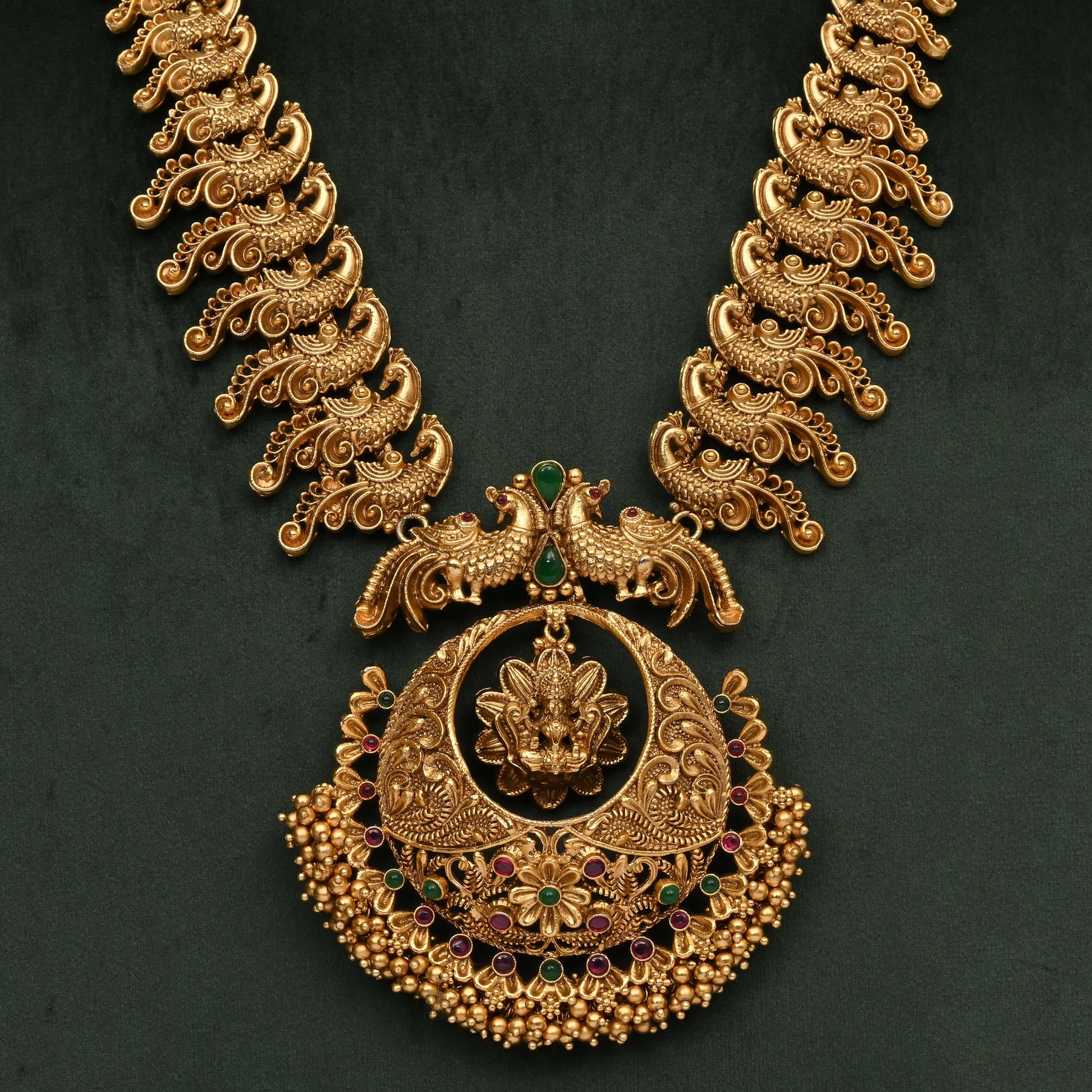 This handcrafted Temple Necklace Set features an exclusive goddess Lakshmi design, embodying traditional elegance with a real gold appearance. Expertly crafted to replicate the richness of authentic gold, it offers a timeless statement piece perfect for ceremonial and festive occasions. The intricate detailing highlights cultural artistry while providing a distinguished look that complements traditional attire.