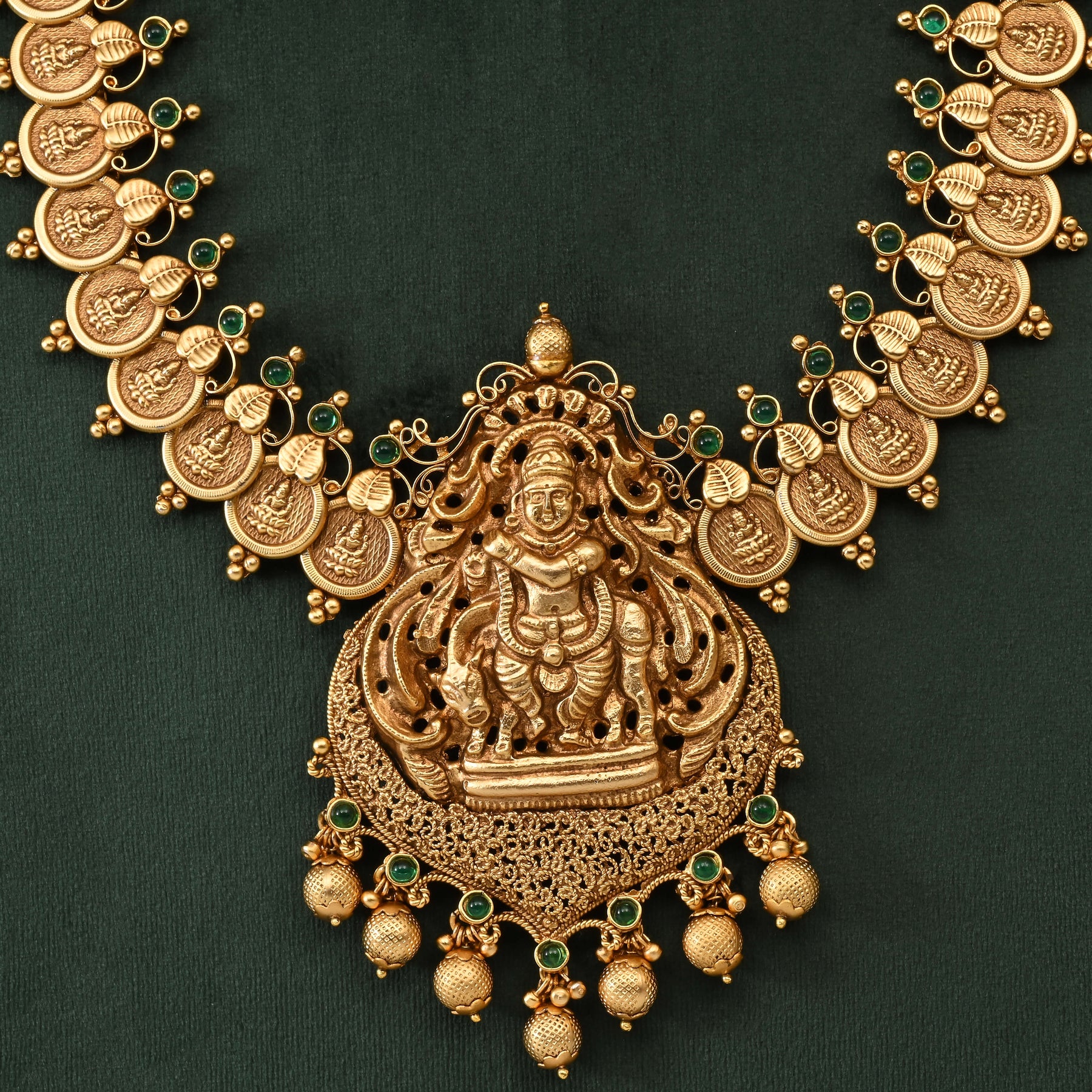 Embrace divine elegance with this exquisite Temple Necklace Set, a handcrafted masterpiece inspired by traditional temple jewelry. Featuring a striking Lord Krishna pendant in lustrous gold-look finish, this set captures the spiritual essence of authentic Lakshmi kasumala designs. Each piece is meticulously crafted as a one-of-a-kind creation, blending timeless artistry with devotional symbolism. Perfect for festivals, celebrations, or everyday spiritual connection, this necklace set showcases the finest traditions of temple jewelry craftsmanship.