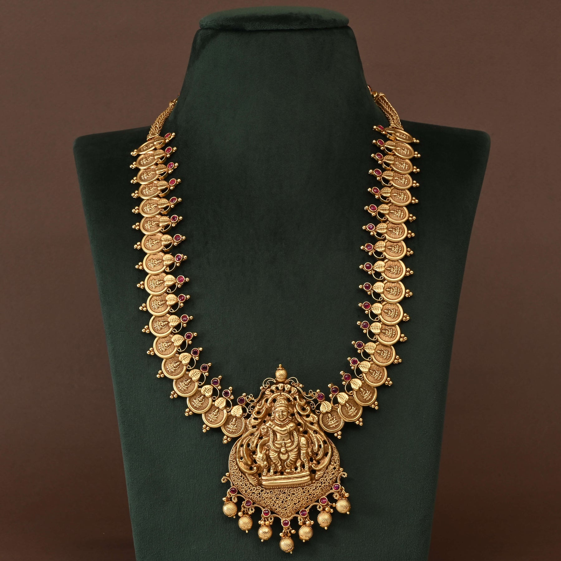 Elevate your spiritual elegance with this exquisite Temple Necklace Set, a handcrafted masterpiece inspired by traditional temple jewelry. Featuring a striking Lord Krishna pendant in lustrous gold-tone finish, this one-of-a-kind piece embodies the sacred essence of Lakshmi kasumala designs. Each detail is meticulously crafted to honor timeless traditions, making it an ideal choice for religious ceremonies, festivals, or those seeking meaningful jewelry that connects them to their heritage. A treasured addition to any collection.