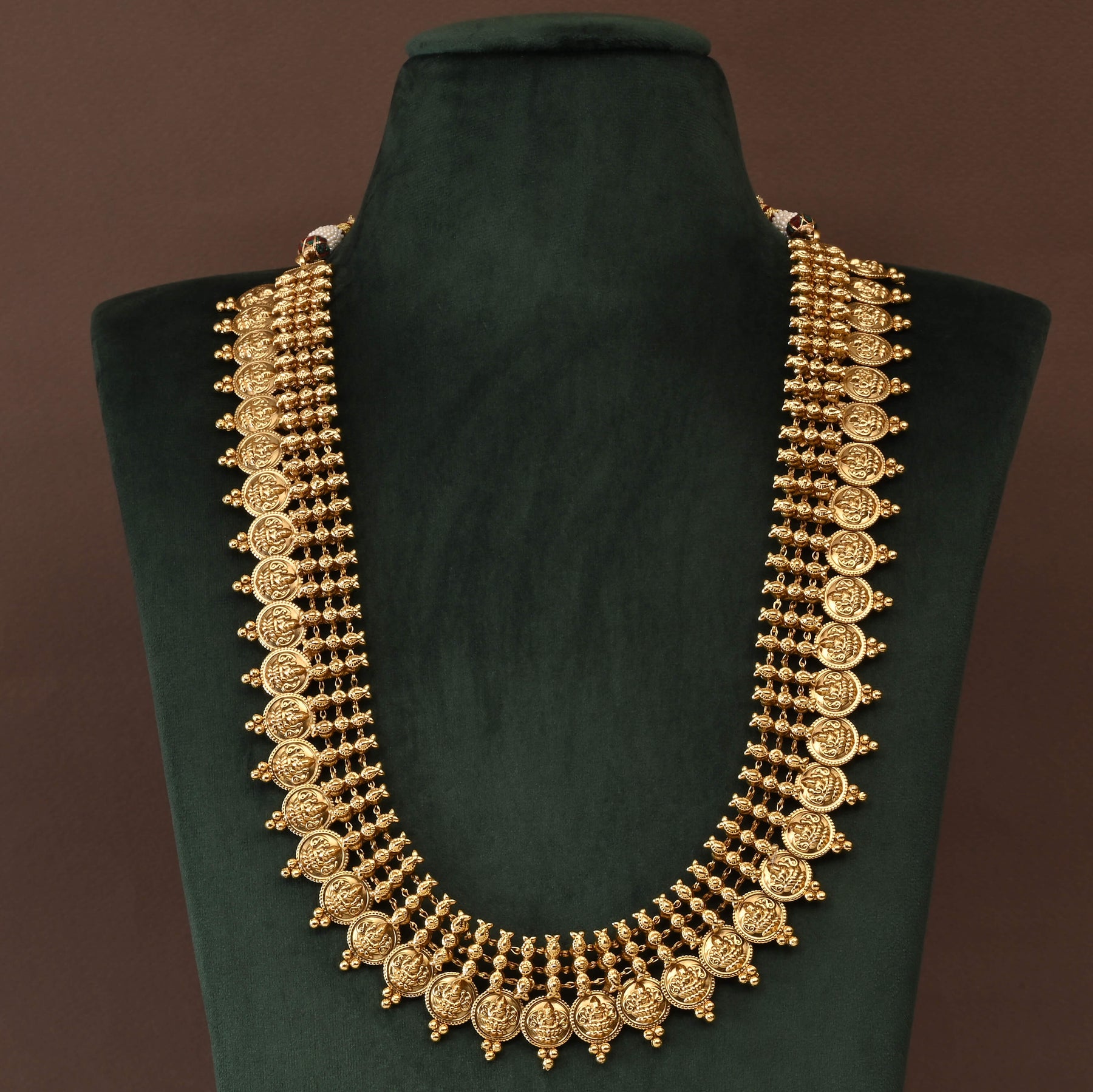 Elevate your traditional ensemble with this exquisite Temple Necklace Set, a handcrafted masterpiece inspired by classic Lakshmi kasumala designs. Each piece showcases authentic gold-look finish that captures the timeless elegance of temple jewelry. Meticulously crafted with traditional techniques, this one-of-a-kind set combines spiritual significance with refined artistry. Perfect for festivals, weddings, and special occasions, it brings an air of sophistication and cultural heritage to any celebration. A treasured addition to your jewelry collection that honors timeless craftsmanship.