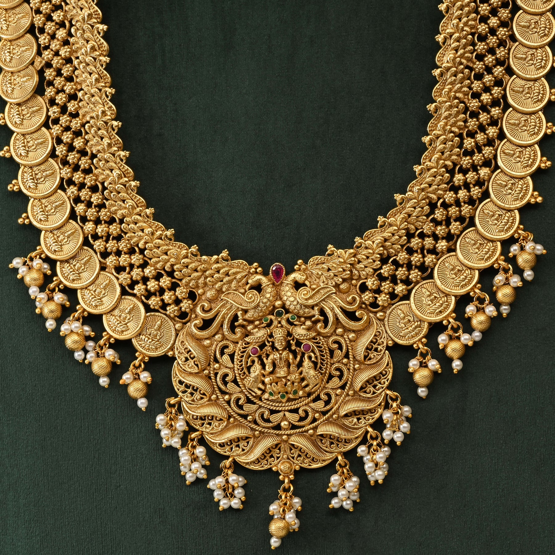 Elevate your traditional ensemble with this exquisite Temple Necklace Set, a handcrafted masterpiece inspired by classic Lakshmi kasumala designs. Each piece showcases authentic gold-look finish that captures the timeless elegance of temple jewelry. Meticulously crafted with traditional techniques, this one-of-a-kind set reflects the artistry of heritage jewelry-making. Perfect for festivals, weddings, and special occasions, it brings divine grace and cultural richness to your collection. A treasured investment in authentic craftsmanship and enduring style.