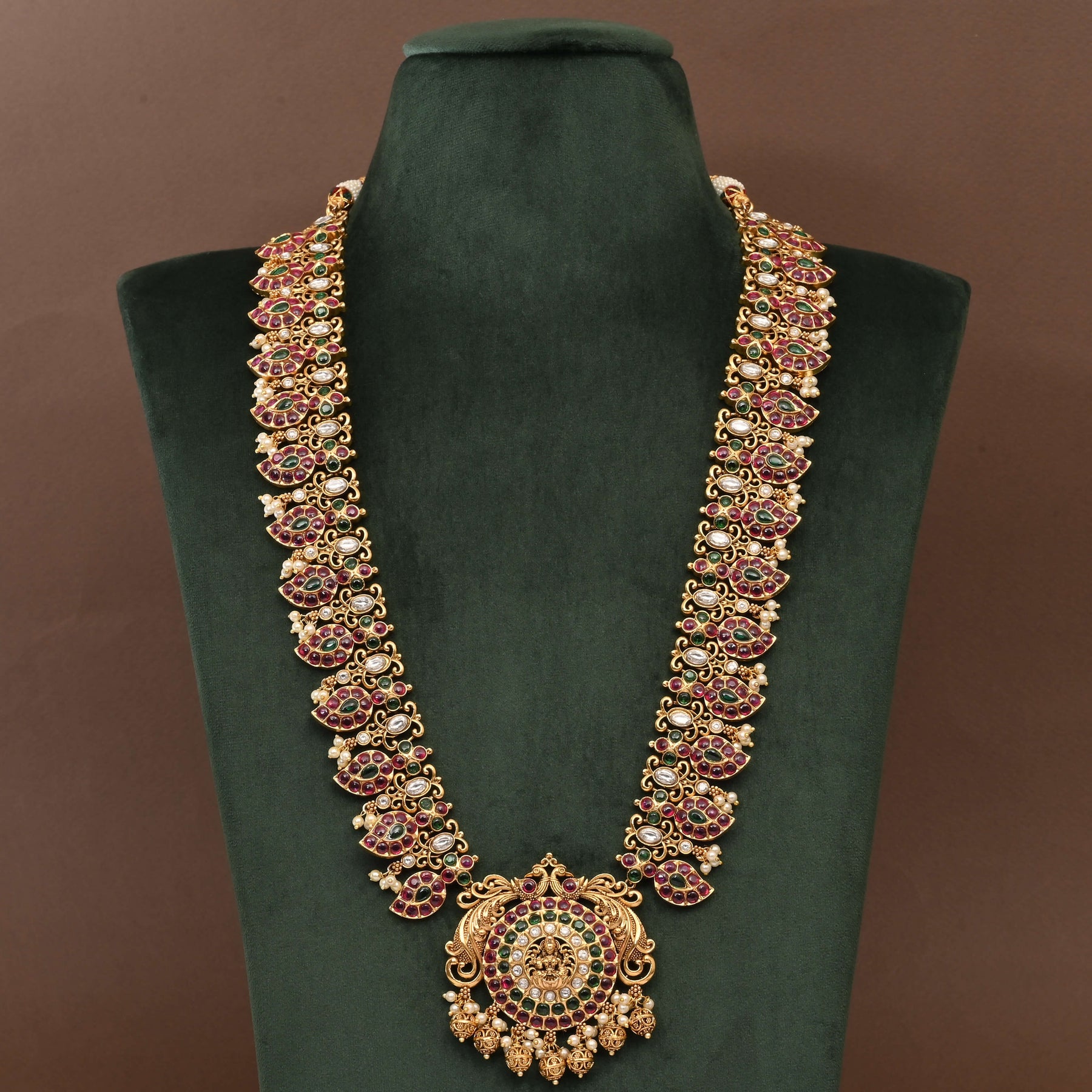 Elevate your traditional attire with this expertly handcrafted Temple Necklace Set, featuring a gold finish that mimics the rich luster of real gold. Adorned with semi-precious ruby stones, this exclusive design reflects authentic craftsmanship and intricate detailing. Perfect for special occasions, it offers the timeless elegance and cultural heritage synonymous with temple-inspired jewelry.