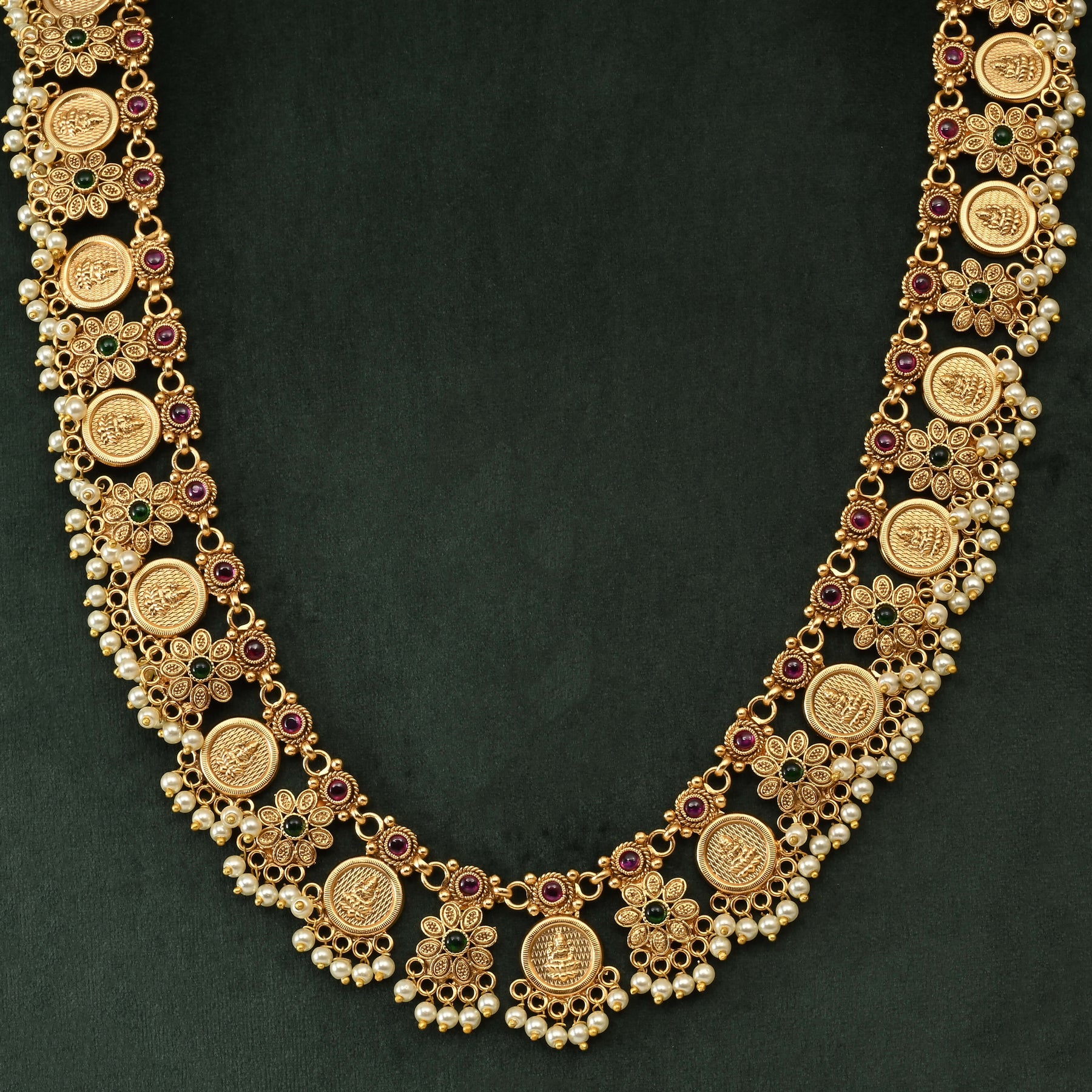 Elevate your traditional ensemble with this exquisite Temple Necklace Set, a handcrafted masterpiece inspired by sacred temple jewelry. Featuring an authentic gold-look finish, this Lakshmi Kasumala captures the essence of timeless craftsmanship with intricate detailing that reflects centuries of artisanal tradition. Each piece is uniquely created, ensuring you own a one-of-a-kind treasure that celebrates cultural heritage and refined elegance. Perfect for festivals, weddings, or special occasions, this necklace set embodies the spiritual grace and sophisticated beauty of traditional Indian jewelry.