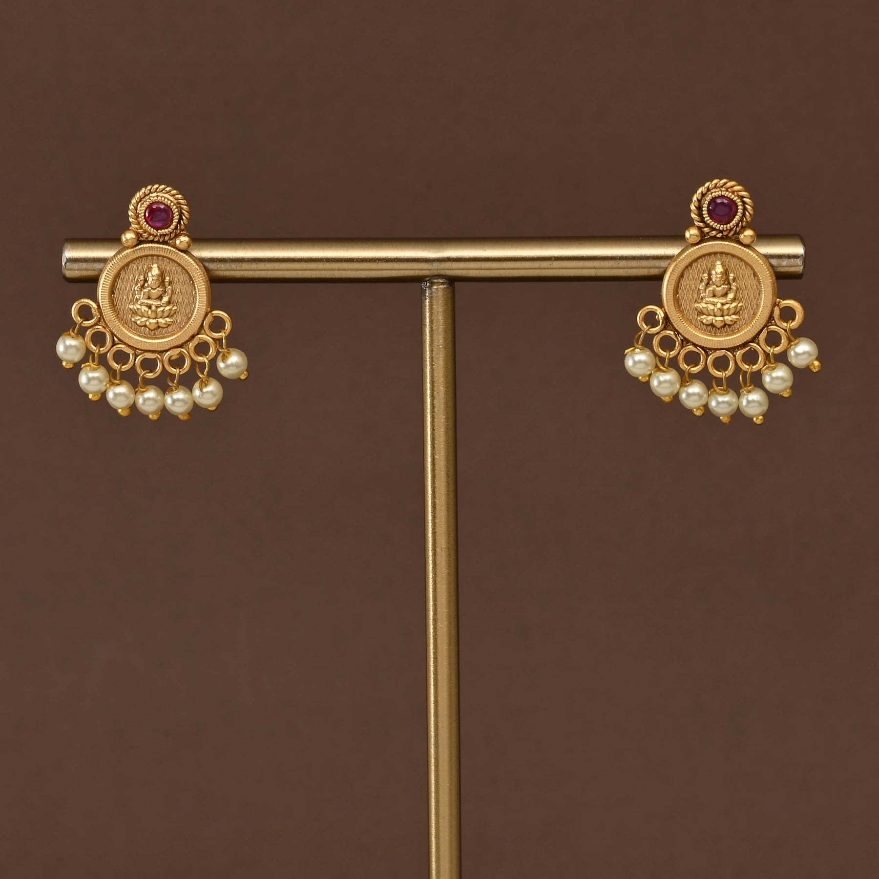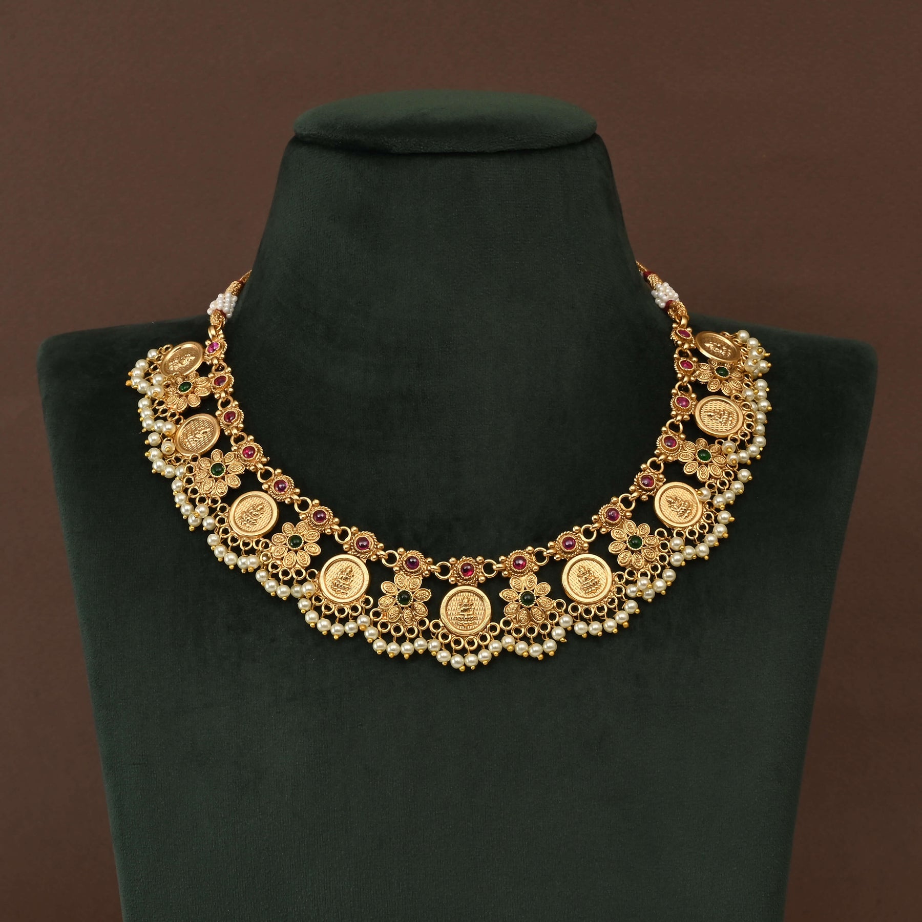 Elevate your traditional ensemble with this exquisite Temple Necklace Set, a handcrafted masterpiece inspired by classic Lakshmi kasumala designs. Each piece showcases authentic gold-look finish that captures the radiance of temple jewelry, meticulously crafted to honor time-honored artistry. This one-of-a-kind set combines spiritual significance with refined elegance, making it an ideal choice for festivals, weddings, and special occasions. The intricate detailing reflects generations of jewelry-making expertise, ensuring you wear a truly distinctive treasure that celebrates cultural heritage and timeless beauty.