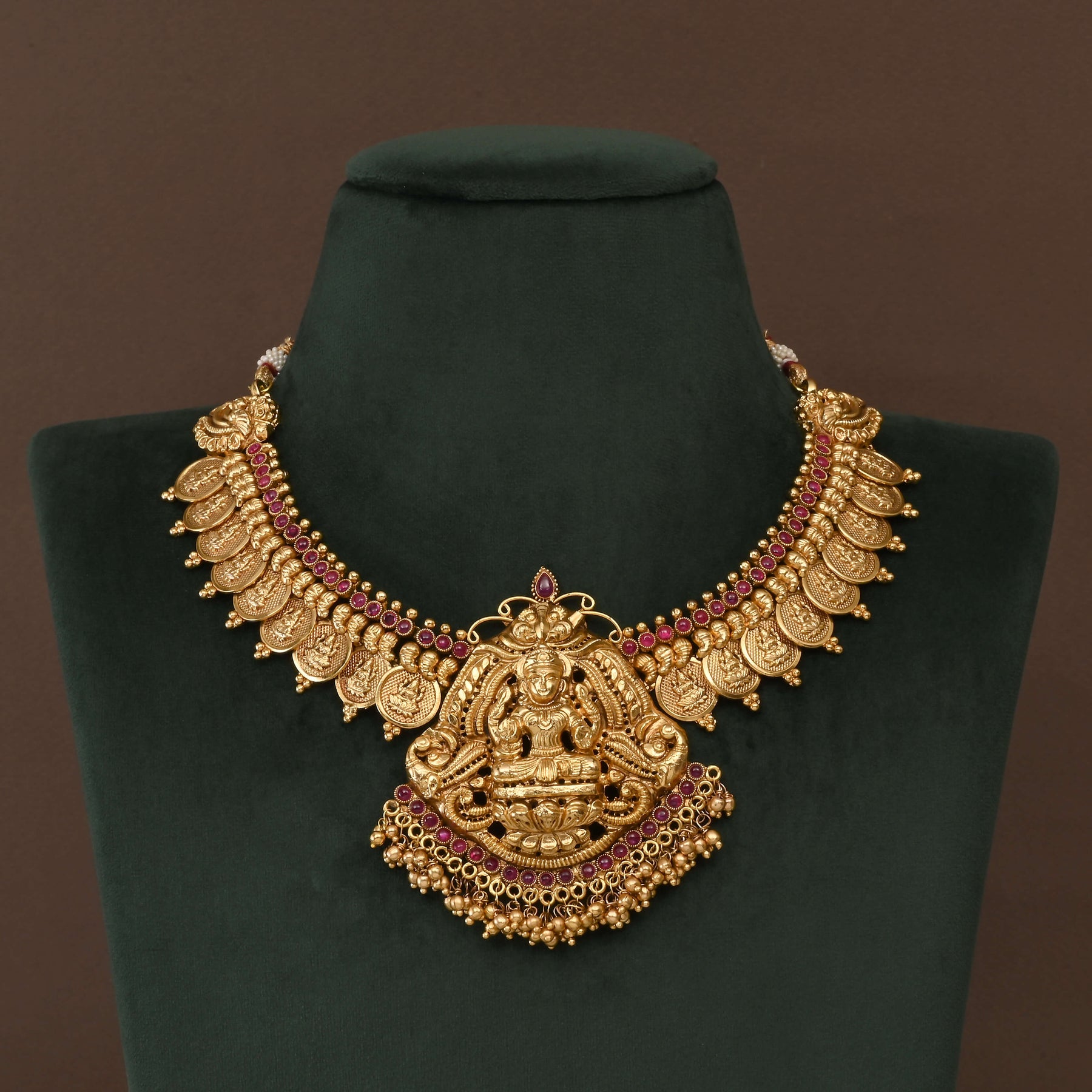 Elevate your traditional ensemble with this exquisite Temple Necklace Set, a handcrafted masterpiece inspired by classic Lakshmi kasumala designs. Each piece showcases authentic gold-look finish with meticulous detailing that reflects centuries of jewelry artistry. This one-of-a-kind creation combines spiritual significance with timeless elegance, making it an ideal choice for festivals, weddings, and special occasions. The intricate craftsmanship ensures durability while maintaining the authentic aesthetic of temple jewelry. A treasured addition to any traditional jewelry collection.