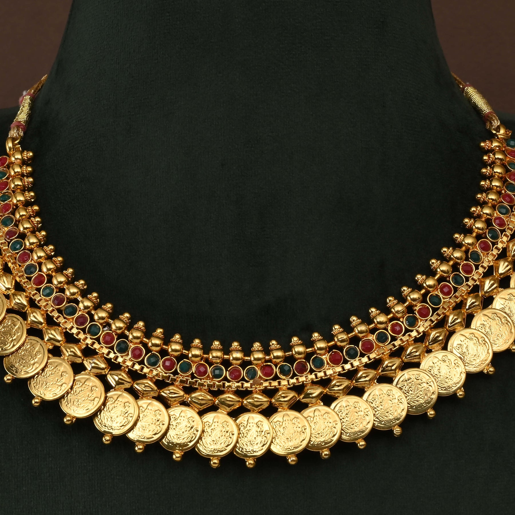 Elevate your traditional ensemble with this exquisite Temple Necklace Set, a handcrafted masterpiece inspired by classic Lakshmi kasumala designs. Each piece showcases authentic gold-look finish that captures the timeless elegance of temple jewelry. Meticulously crafted with traditional techniques, this one-of-a-kind set combines spiritual significance with refined artistry. Perfect for festivals, weddings, and special occasions, it brings an air of sophistication and cultural heritage to any celebration. A treasured addition to your jewelry collection that honors timeless craftsmanship.