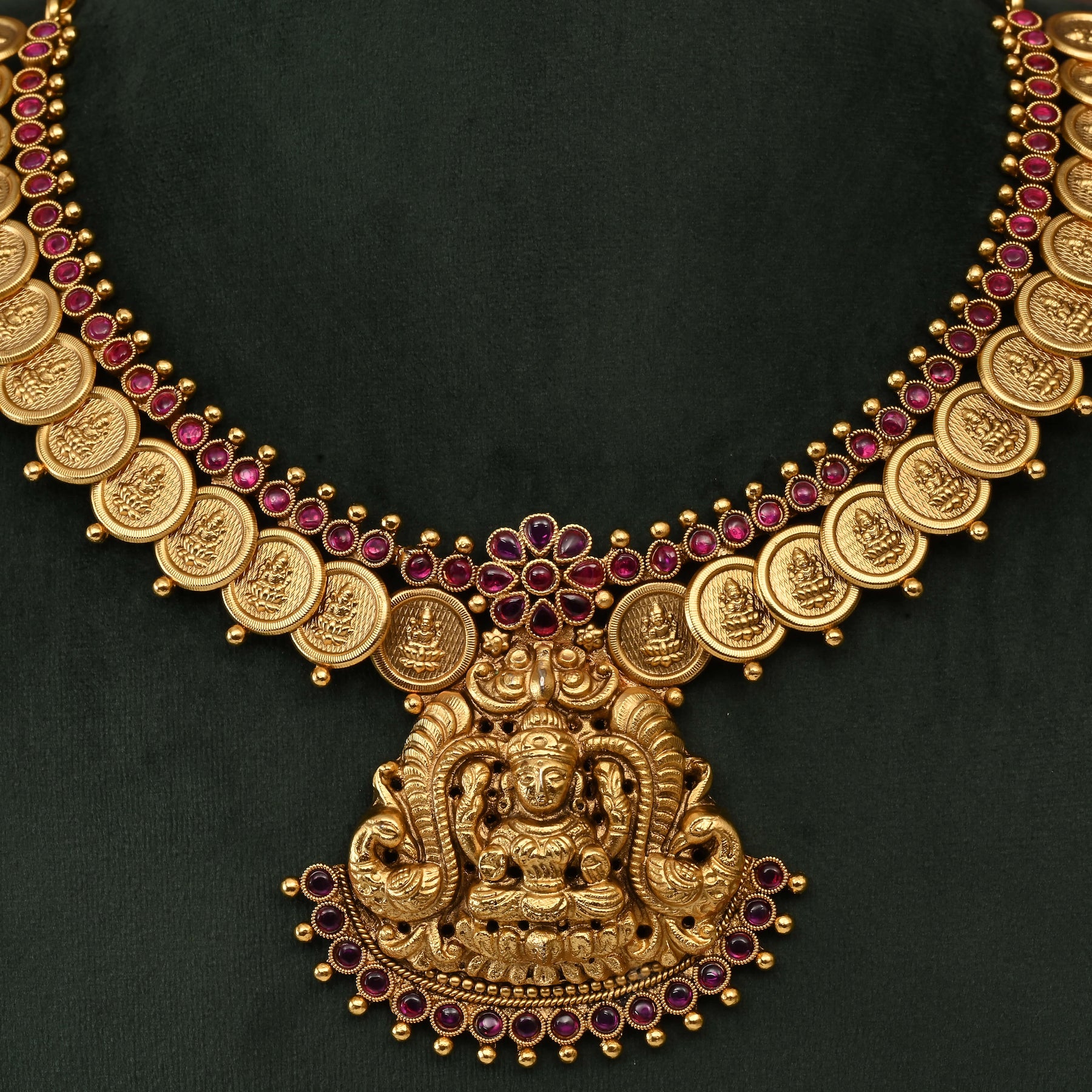Celebrate divine elegance with this exquisite Temple Necklace Set, a handcrafted masterpiece honoring Goddess Lakshmi. Rendered in lustrous gold finish, this traditional kasumala features intricate artisanal detailing that captures the essence of temple jewelry craftsmanship. Each piece is uniquely created, making it a singular treasure for those who appreciate authentic spiritual adornment and timeless cultural heritage.