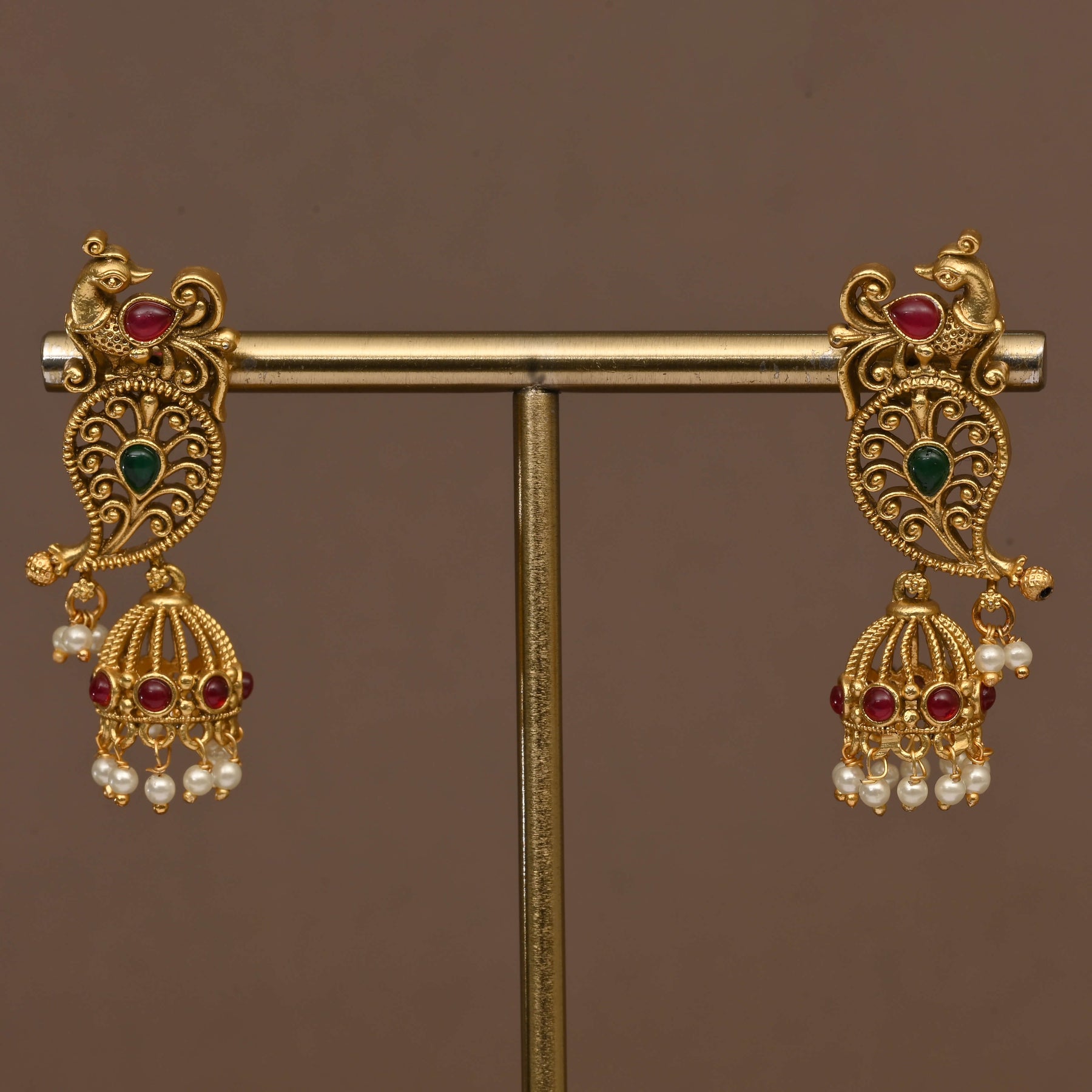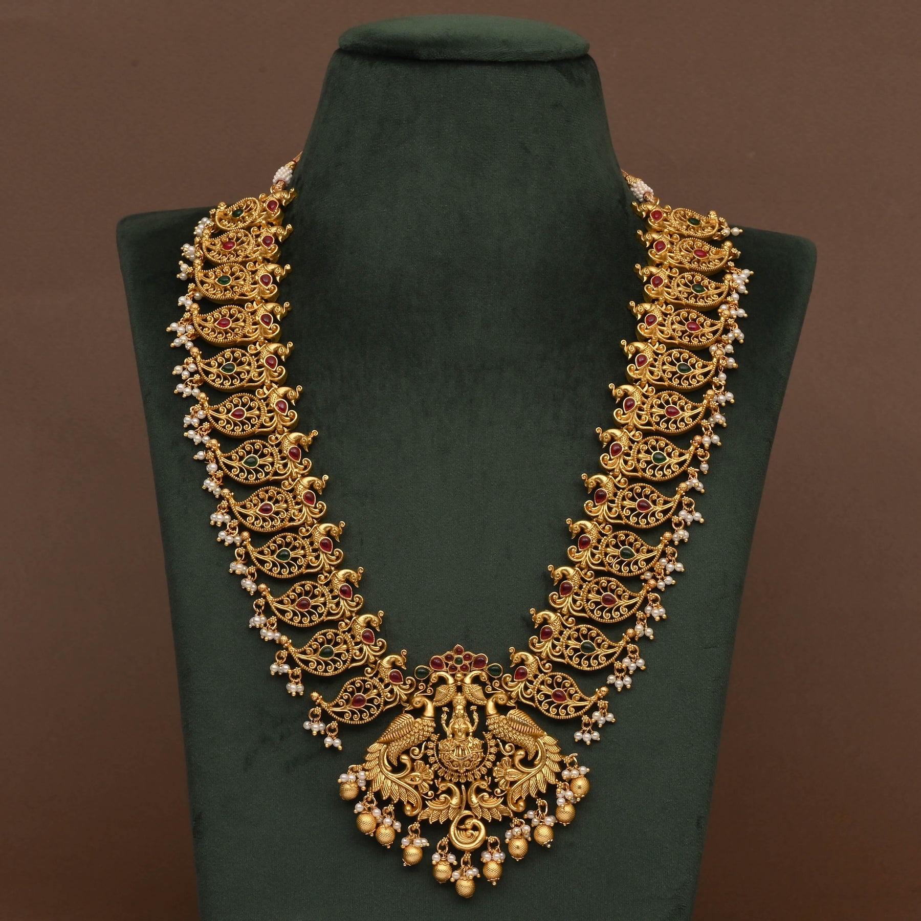 This Temple Necklace Set features a handcrafted design with a rich gold finish that captures the authentic look of real gold. Its traditional motifs and exclusive craftsmanship make it a distinguished accessory, perfect for adding cultural elegance to any outfit. Ideal for those who appreciate artisan quality and timeless style.