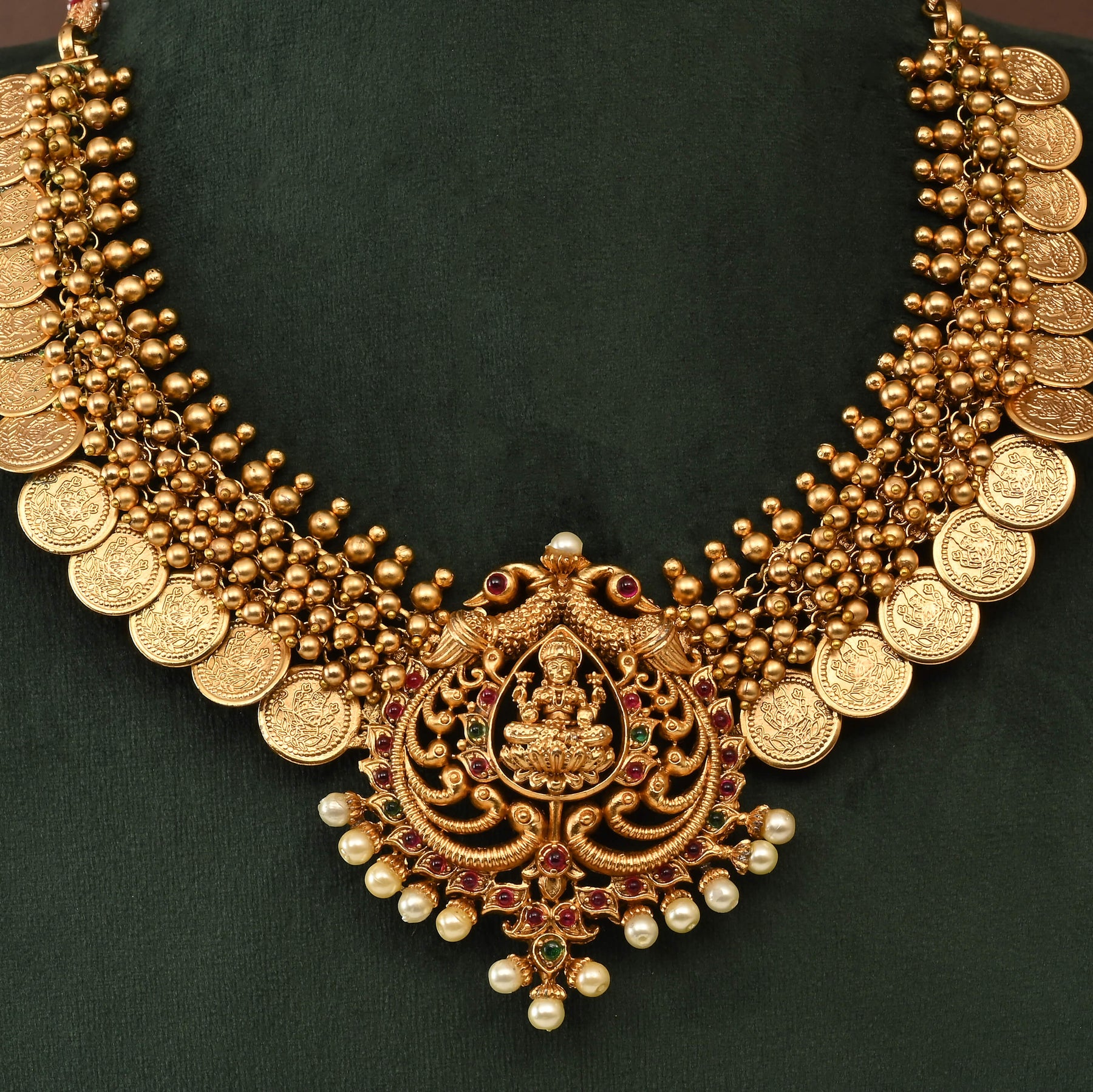 Celebrate divine elegance with this exquisite Temple Necklace Set, a handcrafted masterpiece honoring Goddess Lakshmi. Rendered in lustrous gold finish, this traditional kasumala features intricate artisanal detailing that captures the essence of temple jewelry craftsmanship. Each piece is uniquely created, making it a singular treasure for those who appreciate authentic spiritual adornment and timeless cultural heritage.