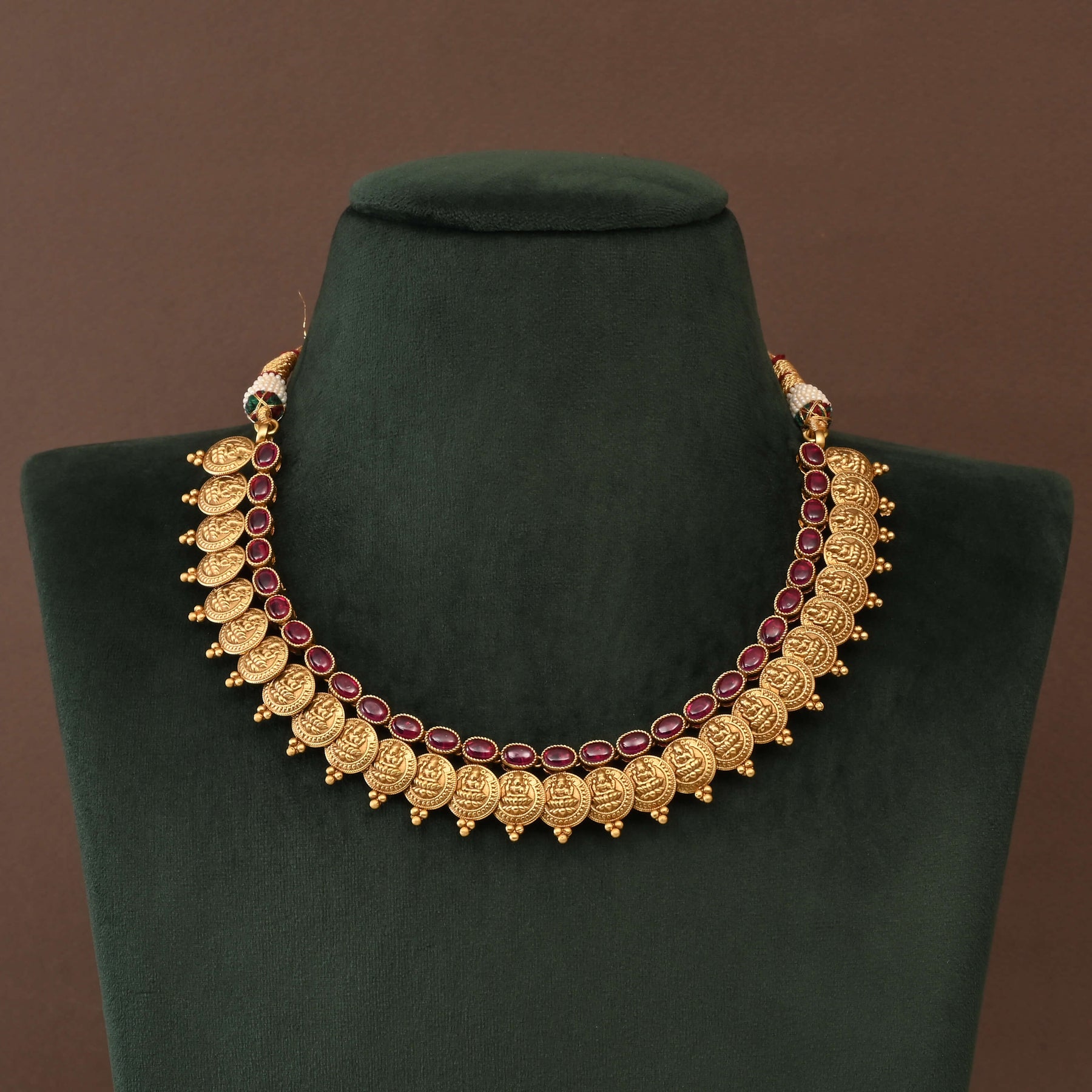 Celebrate divine elegance with this exquisite Temple Necklace Set, a handcrafted masterpiece honoring Goddess Lakshmi. Rendered in lustrous gold finish, this traditional kasumala features intricate artisanal detailing that captures the essence of temple jewelry craftsmanship. Each piece is uniquely created, making it a singular treasure for those who appreciate authentic spiritual adornment and timeless cultural heritage.