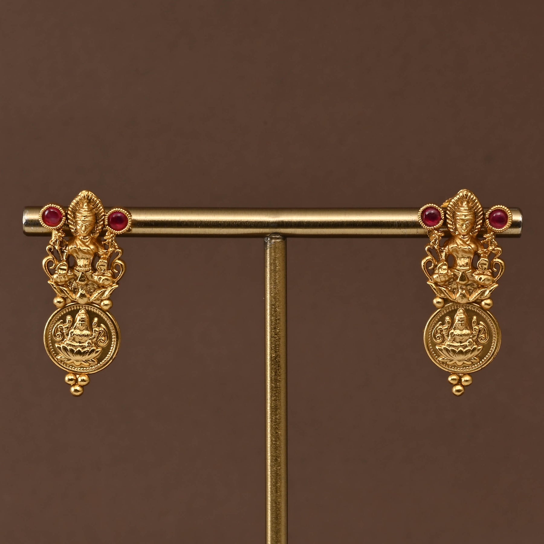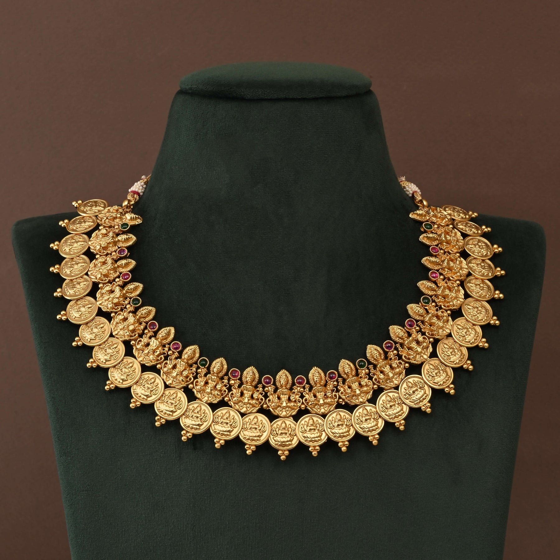 Celebrate divine elegance with this exquisite Temple Necklace Set, a handcrafted masterpiece featuring the revered Goddess Lakshmi kasumala. Meticulously created in lustrous gold finish, each piece showcases traditional artistry and intricate detailing that honors centuries-old temple jewelry craftsmanship. This one-of-a-kind set captures the spiritual essence and timeless beauty of authentic temple wear, making it an ideal choice for religious ceremonies, festivals, or those seeking meaningful, culturally significant jewelry that stands apart from mass-produced alternatives.