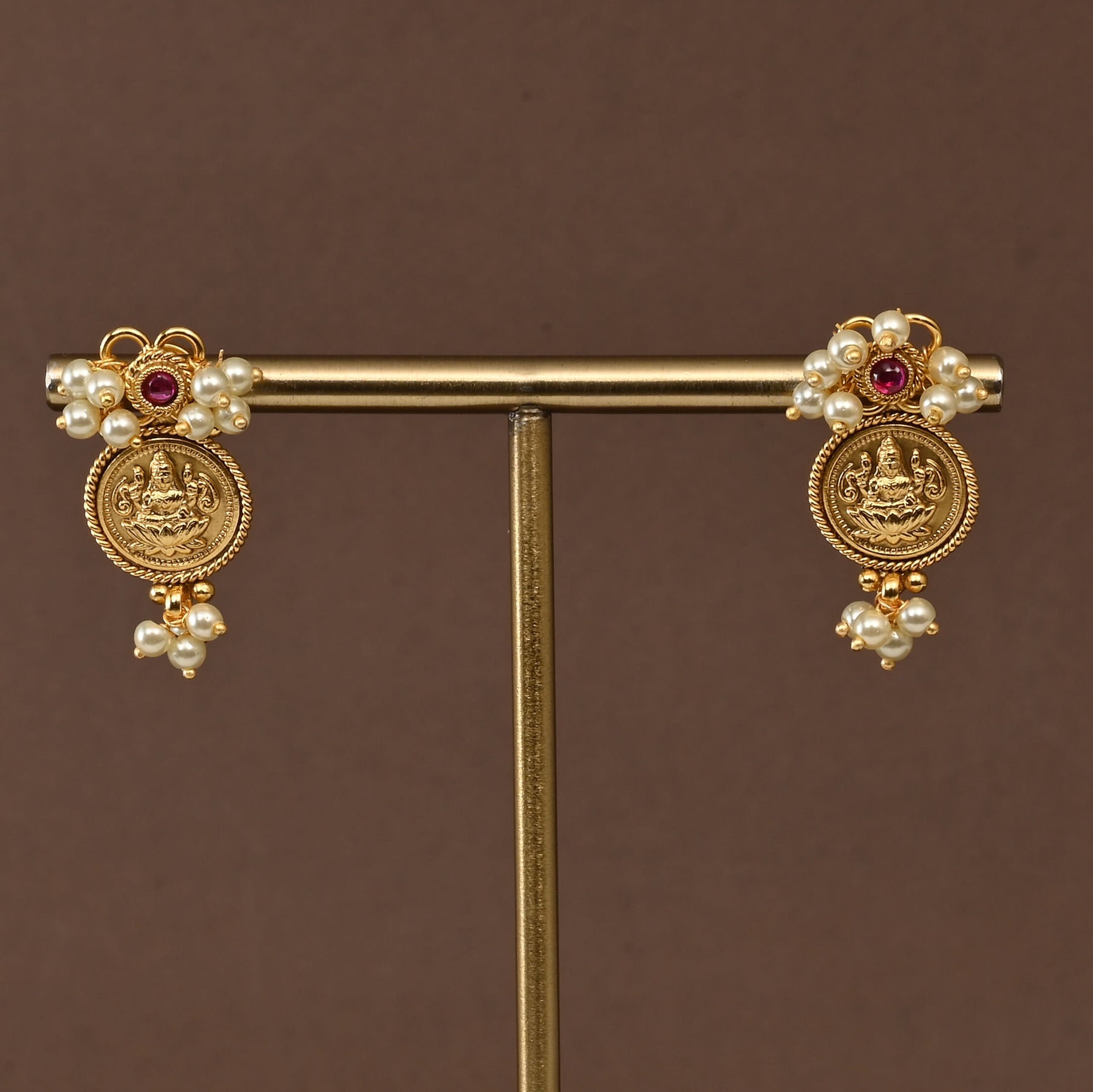Elevate your traditional ensemble with this exquisite Temple Necklace Set, a handcrafted masterpiece featuring the divine Goddess Lakshmi kasumala. Adorned with lustrous pearls that dance gracefully with every movement, this one-of-a-kind piece showcases authentic gold finish craftsmanship. Each detail reflects meticulous artisanal work, honoring centuries-old temple jewelry traditions. Perfect for festive occasions, weddings, or spiritual celebrations, this necklace set combines timeless elegance with spiritual significance, making it a treasured addition to any jewelry collection.