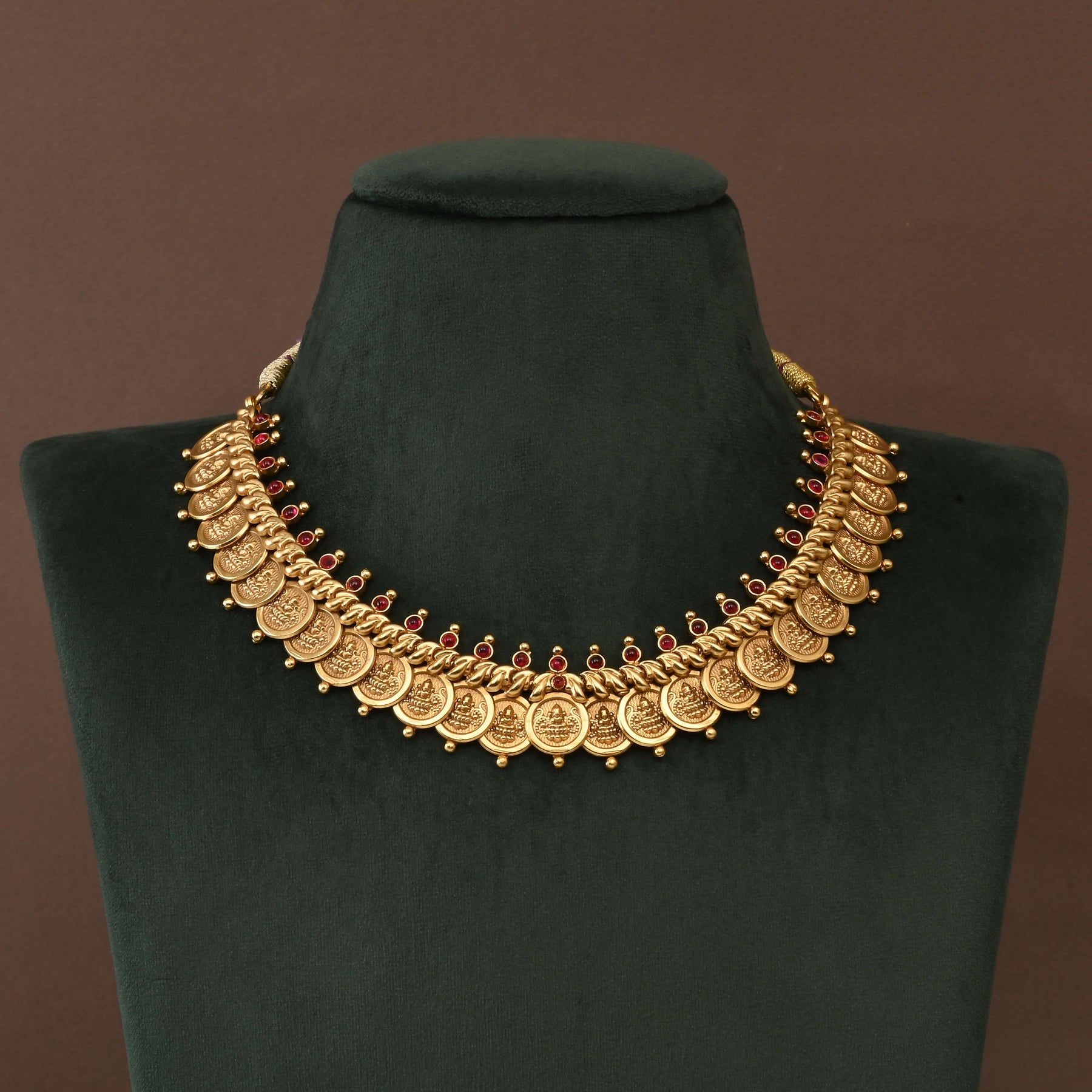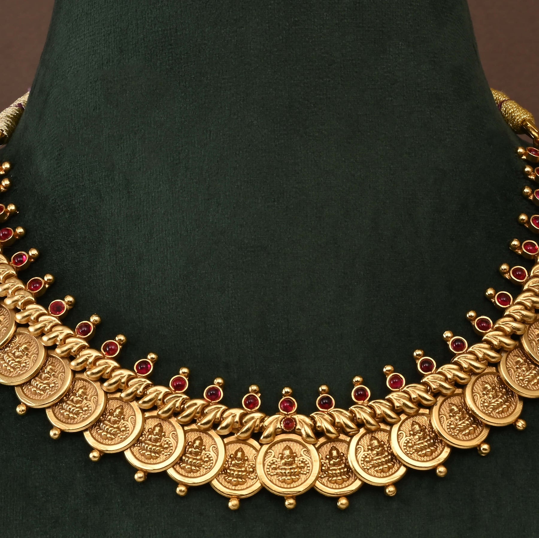 Elevate your spiritual adornment with this exquisite Temple Necklace Set, a handcrafted masterpiece featuring the revered Goddess Lakshmi kasumala. Meticulously designed in lustrous gold finish, this one-of-a-kind piece embodies traditional craftsmanship and sacred artistry. Each detail reflects authentic temple jewelry aesthetics, making it an ideal choice for religious ceremonies, festivals, or those seeking meaningful, heirloom-quality jewelry that honors cultural heritage and devotional elegance.