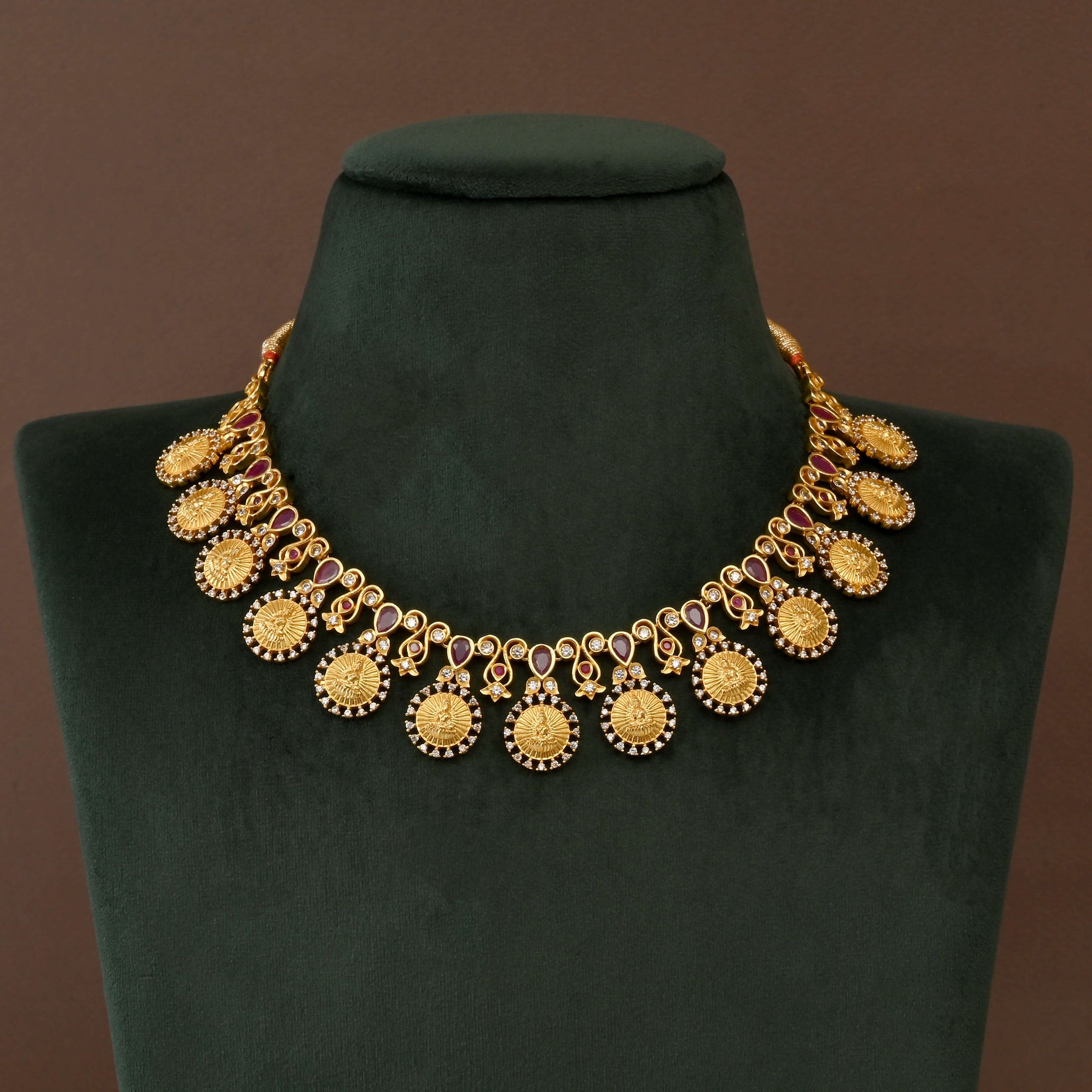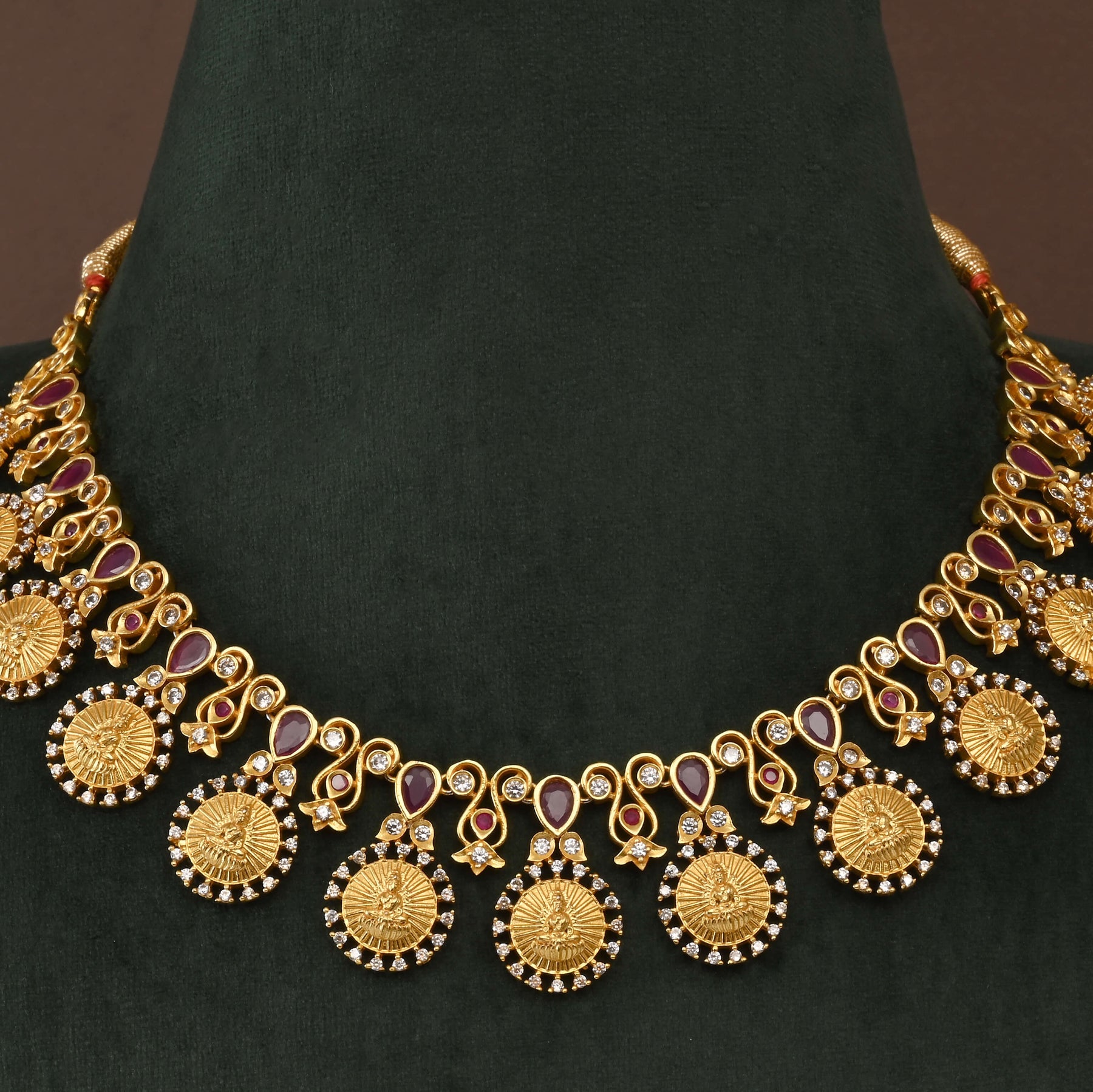 Elevate your spiritual elegance with this exquisite Temple Necklace Set, a handcrafted masterpiece inspired by traditional goddess Lakshmi designs. Adorned with lustrous real CZ stones that catch light beautifully, this one-of-a-kind piece features authentic gold finish detailing that honors classical temple jewelry aesthetics. Each necklace is meticulously crafted by skilled artisans, ensuring superior quality and timeless appeal. Perfect for festive occasions, religious ceremonies, or those seeking to embrace cultural heritage with refined sophistication.