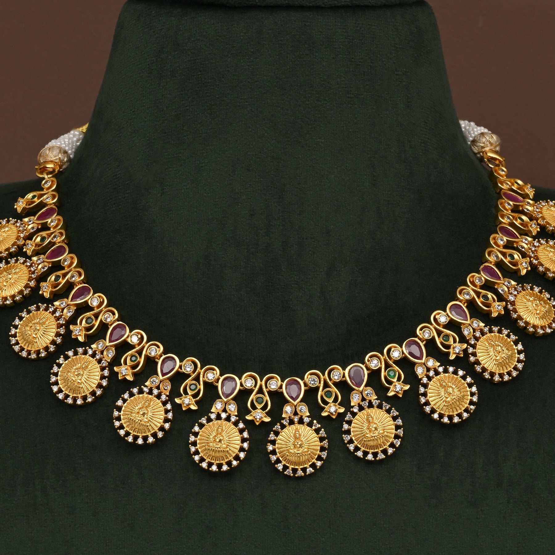 Elevate your traditional ensemble with this exquisite Temple Necklace Set, a masterpiece of handcrafted artistry. Featuring the divine Goddess Lakshmi kasumala design, this one-of-a-kind piece showcases authentic gold finish with brilliant CZ stones that capture light beautifully. Each necklace is meticulously crafted by skilled artisans, honoring centuries-old temple jewelry traditions. The intricate detailing and premium stone work make this an investment-worthy accessory for special occasions, festivals, or everyday elegance. A timeless treasure that celebrates cultural heritage and exceptional craftsmanship.