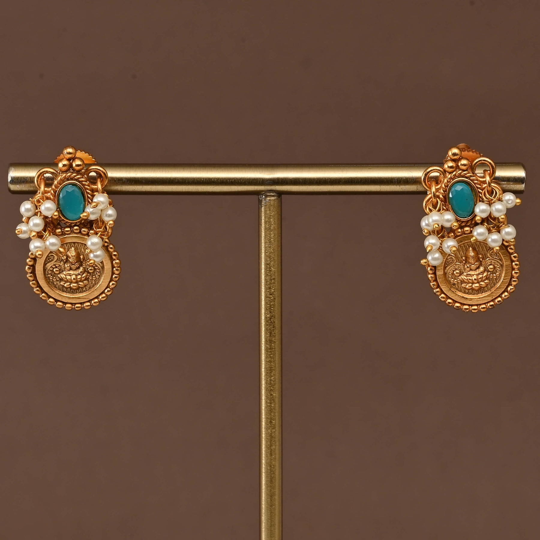 Elevate your spiritual adornment with this exquisite Temple Necklace Set, a masterpiece of traditional craftsmanship. Featuring the divine Goddess Lakshmi kasumala design in lustrous gold finish, this handcrafted piece celebrates timeless elegance. Adorned with semi-precious navarathan stones, each carefully selected for their natural beauty and significance, this one-of-a-kind creation embodies authentic temple jewelry artistry. Perfect for religious ceremonies, festivals, or those seeking to honor sacred traditions with refined sophistication.
