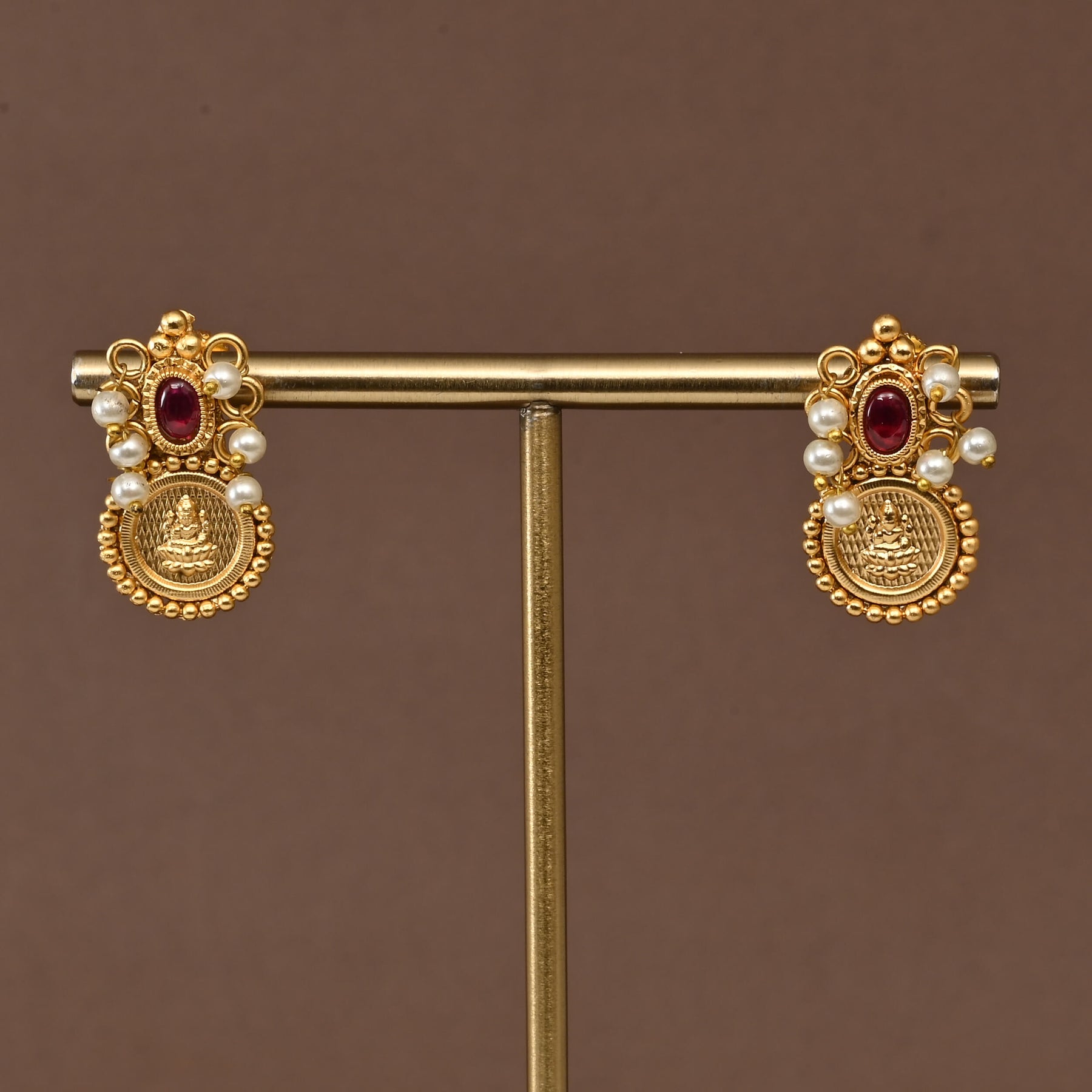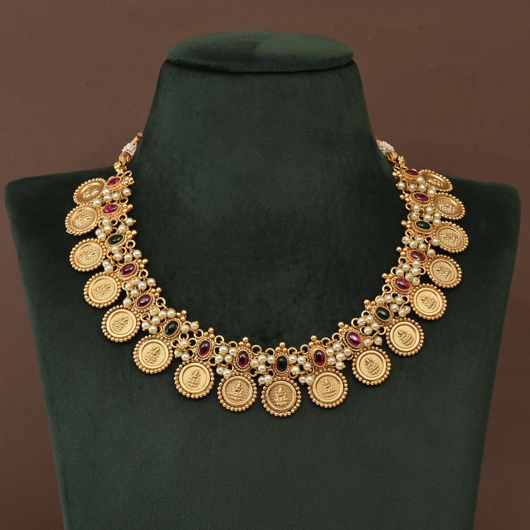 Celebrate divine elegance with this exquisite Temple Necklace Set, a handcrafted masterpiece honoring Goddess Lakshmi. Rendered in lustrous gold finish, this traditional kasumala features intricate artisanal detailing that captures the essence of temple jewelry craftsmanship. Each piece is uniquely created, making it a singular treasure for those who appreciate authentic spiritual adornment and timeless cultural heritage.