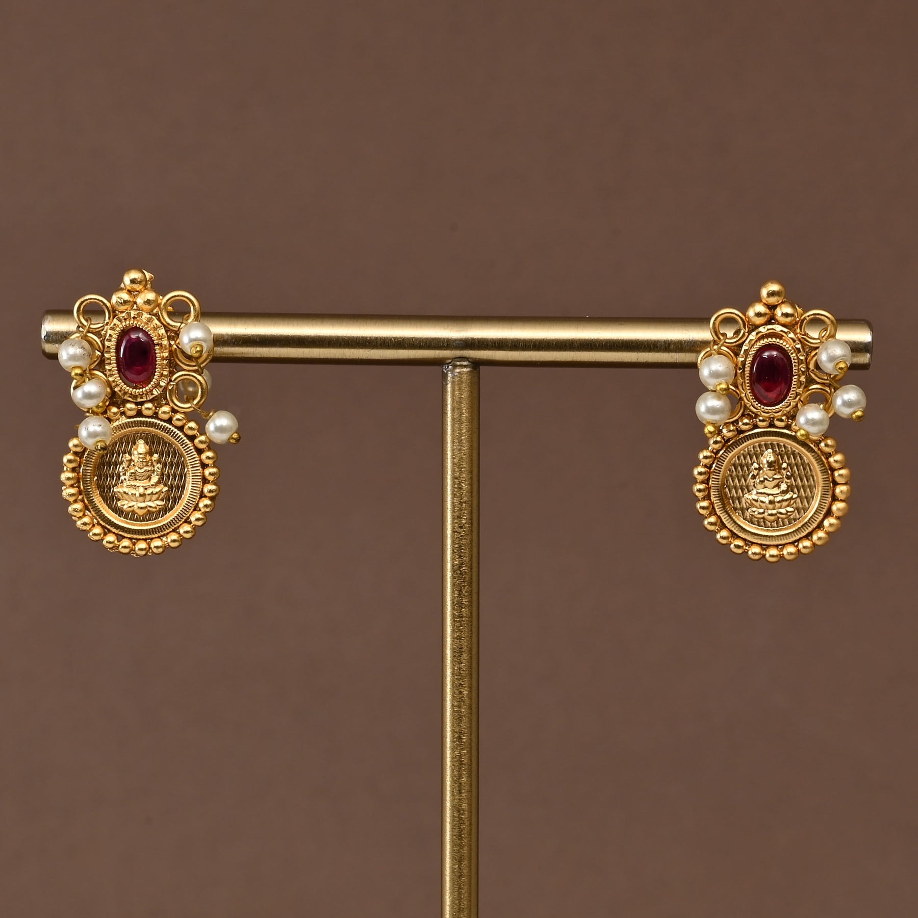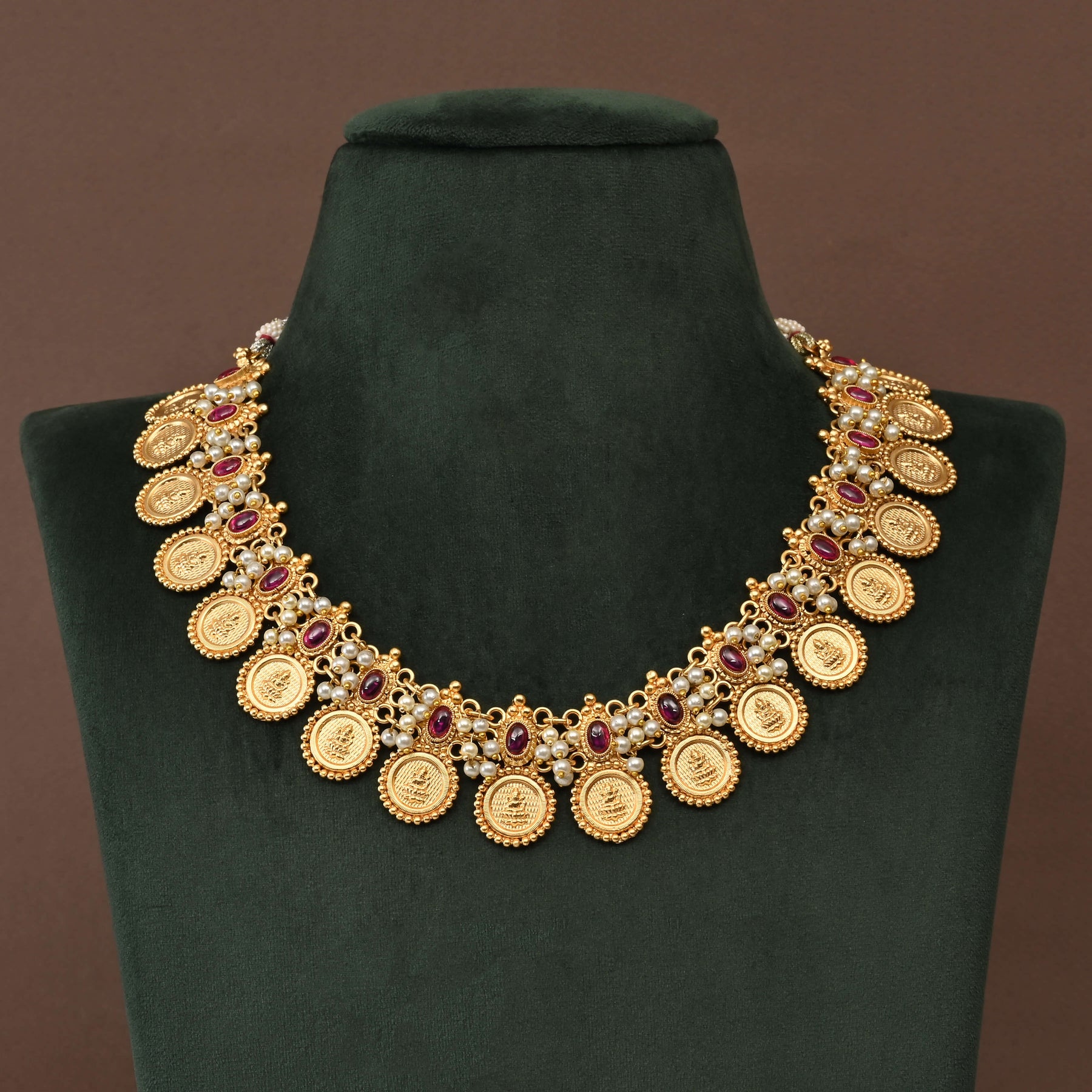 Elevate your spiritual adornment with this exquisite Temple Necklace Set, a handcrafted masterpiece featuring the revered Goddess Lakshmi. Meticulously designed in lustrous gold finish, this traditional kasumala embodies centuries of artisanal craftsmanship. Each piece is uniquely created, making it a one-of-a-kind treasure that celebrates divine femininity and prosperity. Perfect for festivals, religious ceremonies, or as a cherished heirloom, this necklace set seamlessly blends authentic temple jewelry aesthetics with timeless elegance.