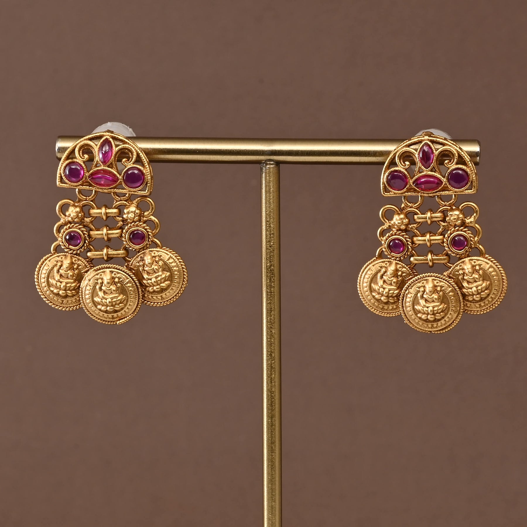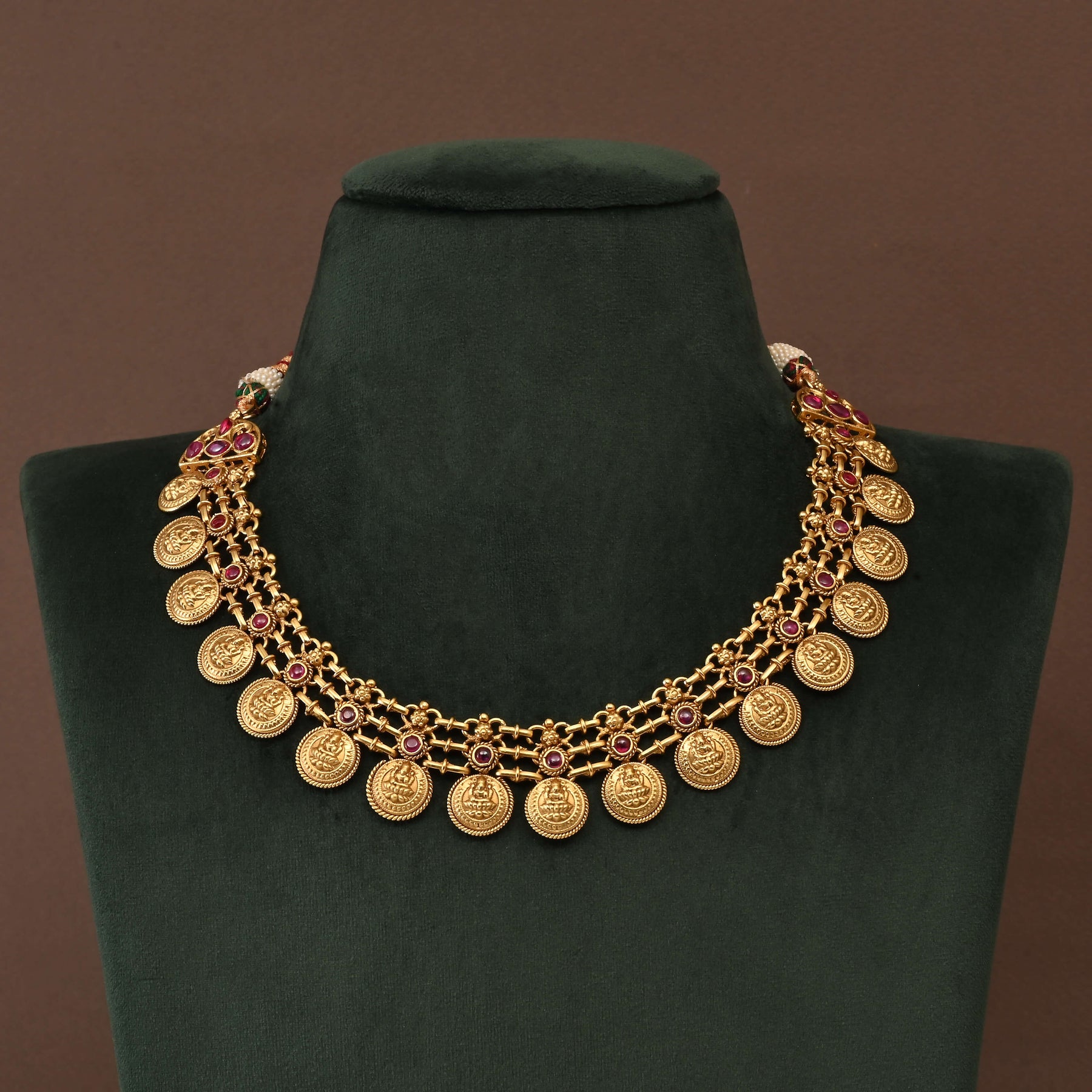 Celebrate divine elegance with this exquisite Temple Necklace Set, a handcrafted masterpiece honoring Goddess Lakshmi. Rendered in lustrous gold finish, this traditional kasumala features intricate artisanal detailing that captures the essence of temple jewelry craftsmanship. Each piece is uniquely created, making it a singular treasure for those who appreciate authentic spiritual adornment and timeless cultural heritage.