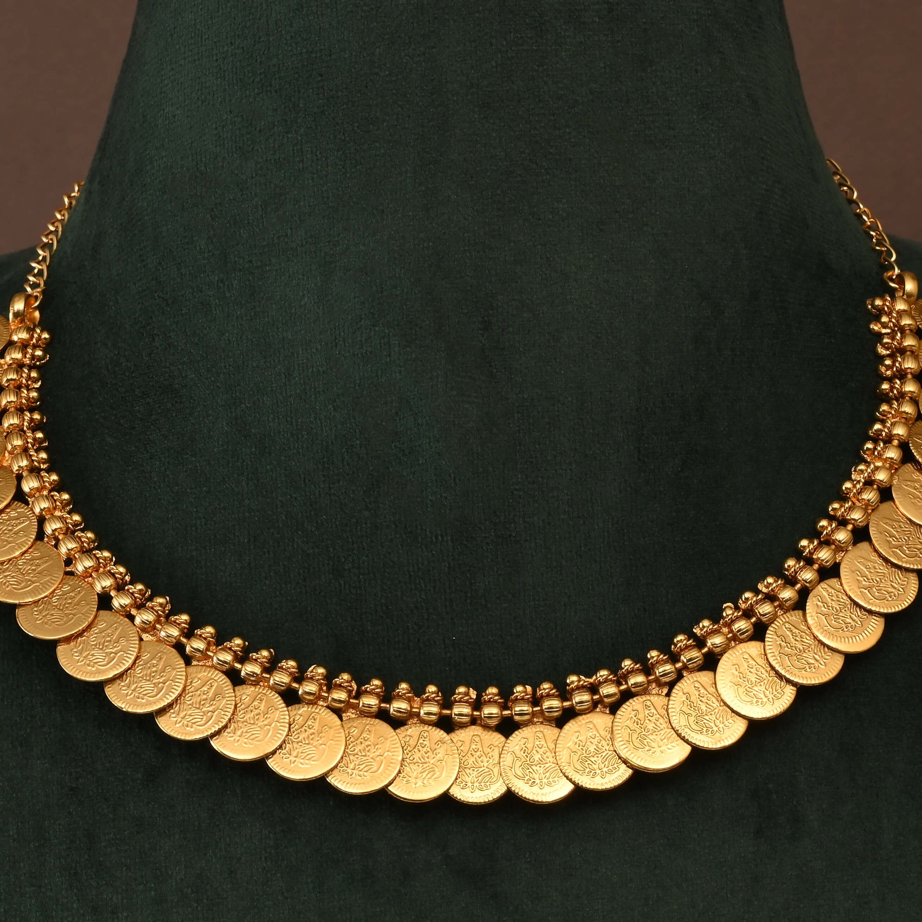 Celebrate divine elegance with this exquisite Temple Necklace Set, a handcrafted masterpiece featuring the revered Goddess Lakshmi. Crafted in lustrous gold finish, this traditional kasumala embodies authentic temple jewelry artistry. Each piece is meticulously created by skilled artisans, making it truly one of a kind. Perfect for religious ceremonies, festivals, or adding spiritual grace to your everyday wear, this necklace set honors timeless craftsmanship and cultural heritage.