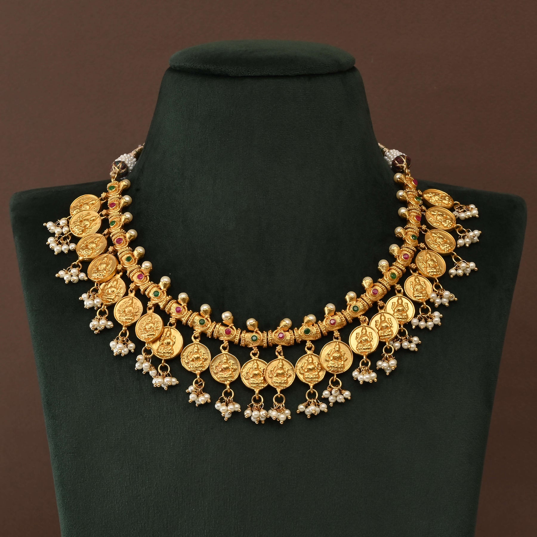 Elevate your traditional ensemble with this exquisite Temple Necklace Set, a handcrafted masterpiece featuring the divine presence of Goddess Lakshmi. Adorned in lustrous gold finish with delicate pearl dangles that catch light with every movement, this kasumala embodies centuries of artisanal craftsmanship. Each piece is uniquely created, making it a one-of-a-kind treasure for those who appreciate authentic temple jewelry. Perfect for festivals, weddings, or spiritual occasions, this necklace seamlessly blends devotion with timeless elegance.