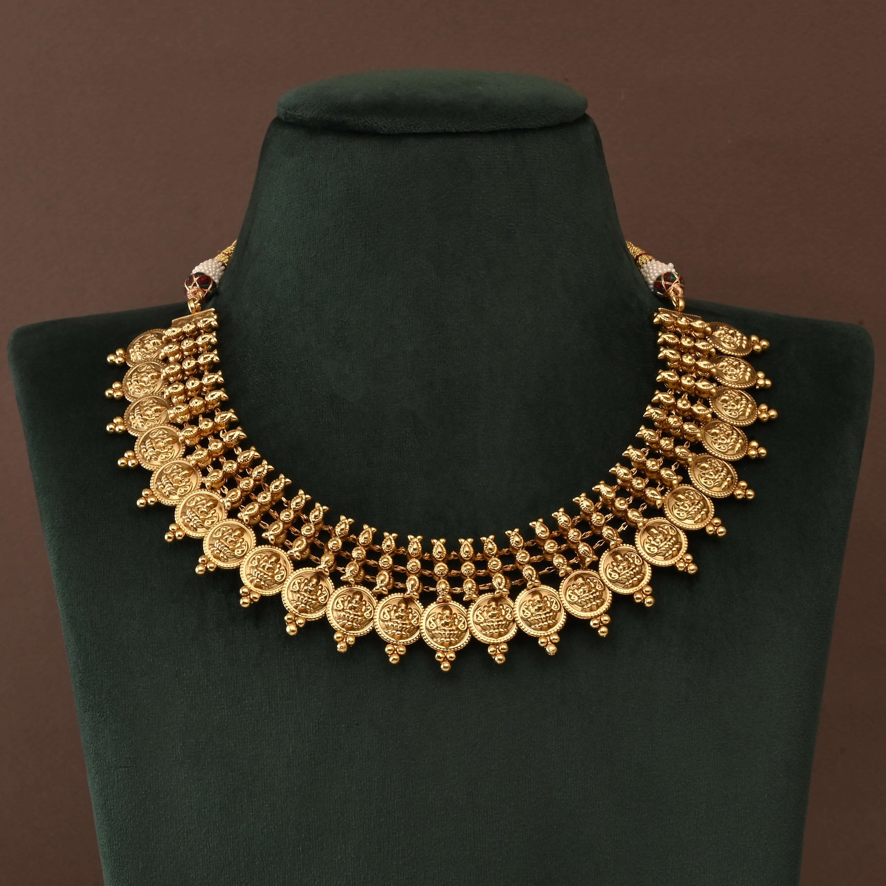 Elevate your spiritual adornment with this exquisite Temple Necklace Set, crafted in lustrous gold finish. Inspired by the revered Goddess Lakshmi kasumala tradition, each piece showcases meticulous handcrafted artistry that honors centuries-old temple jewelry heritage. The intricate design captures the essence of devotional elegance, making it a distinctive choice for religious ceremonies, festivals, or everyday spiritual connection. As a one-of-a-kind creation, this necklace set stands as a testament to authentic craftsmanship and timeless beauty.