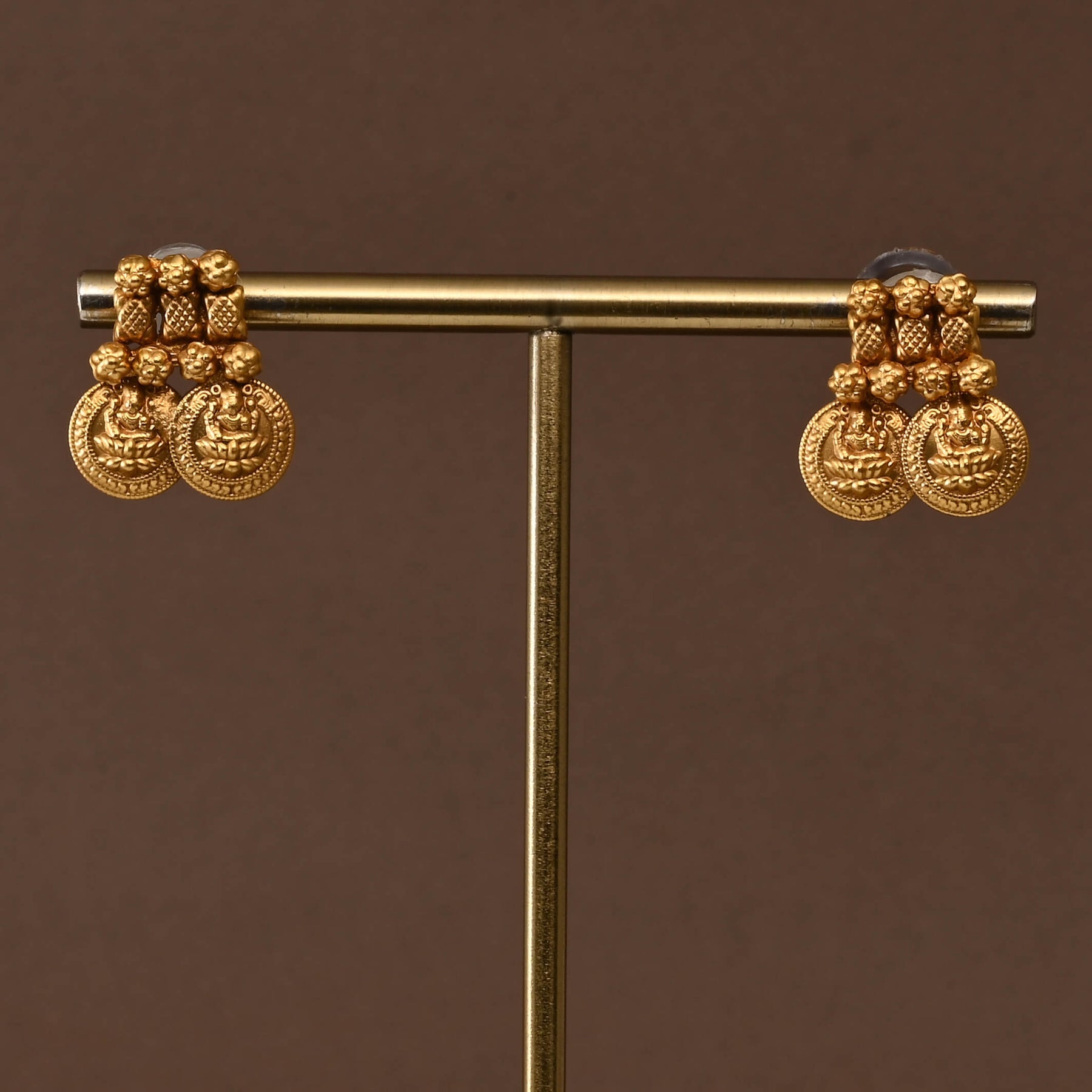 This exquisite Temple Necklace Set showcases the divine beauty of Goddess Lakshmi in a traditional kasumala design. Meticulously handcrafted with a lustrous gold finish, each piece reflects centuries-old temple jewelry artistry. The intricate detailing and authentic craftsmanship make this a truly one-of-a-kind treasure. Perfect for weddings, festivals, and special occasions, this necklace set embodies the timeless elegance of South Indian heritage jewelry while adding a touch of divine grace to your ensemble.