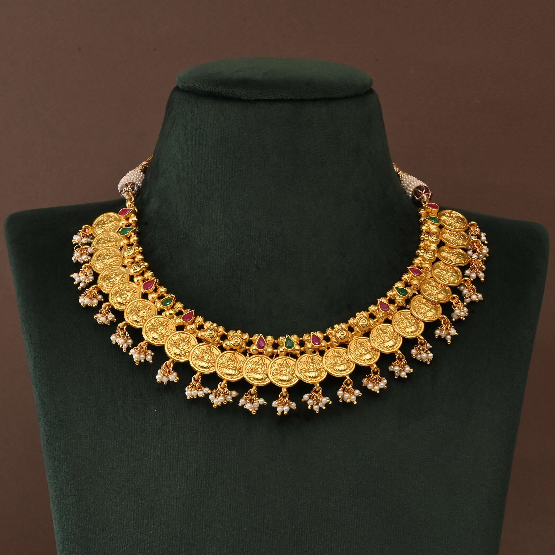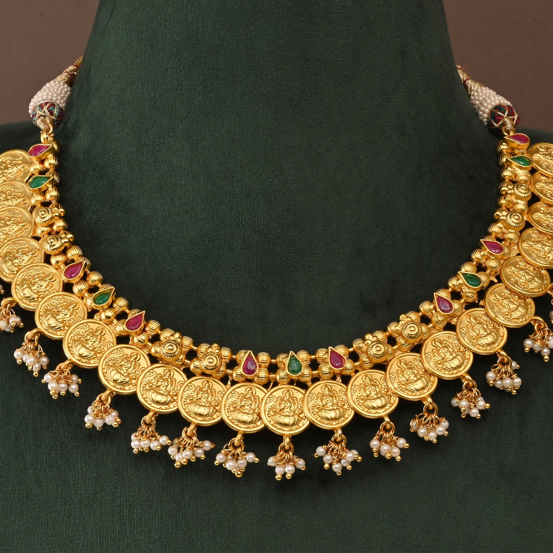 Celebrate divine elegance with this exquisite Temple Necklace Set, a handcrafted masterpiece honoring Goddess Lakshmi. Rendered in lustrous gold finish, this traditional kasumala features intricate artisanal detailing that captures the essence of temple jewelry craftsmanship. Each piece is uniquely created, making it a singular treasure for those who appreciate authentic spiritual adornment and timeless design.