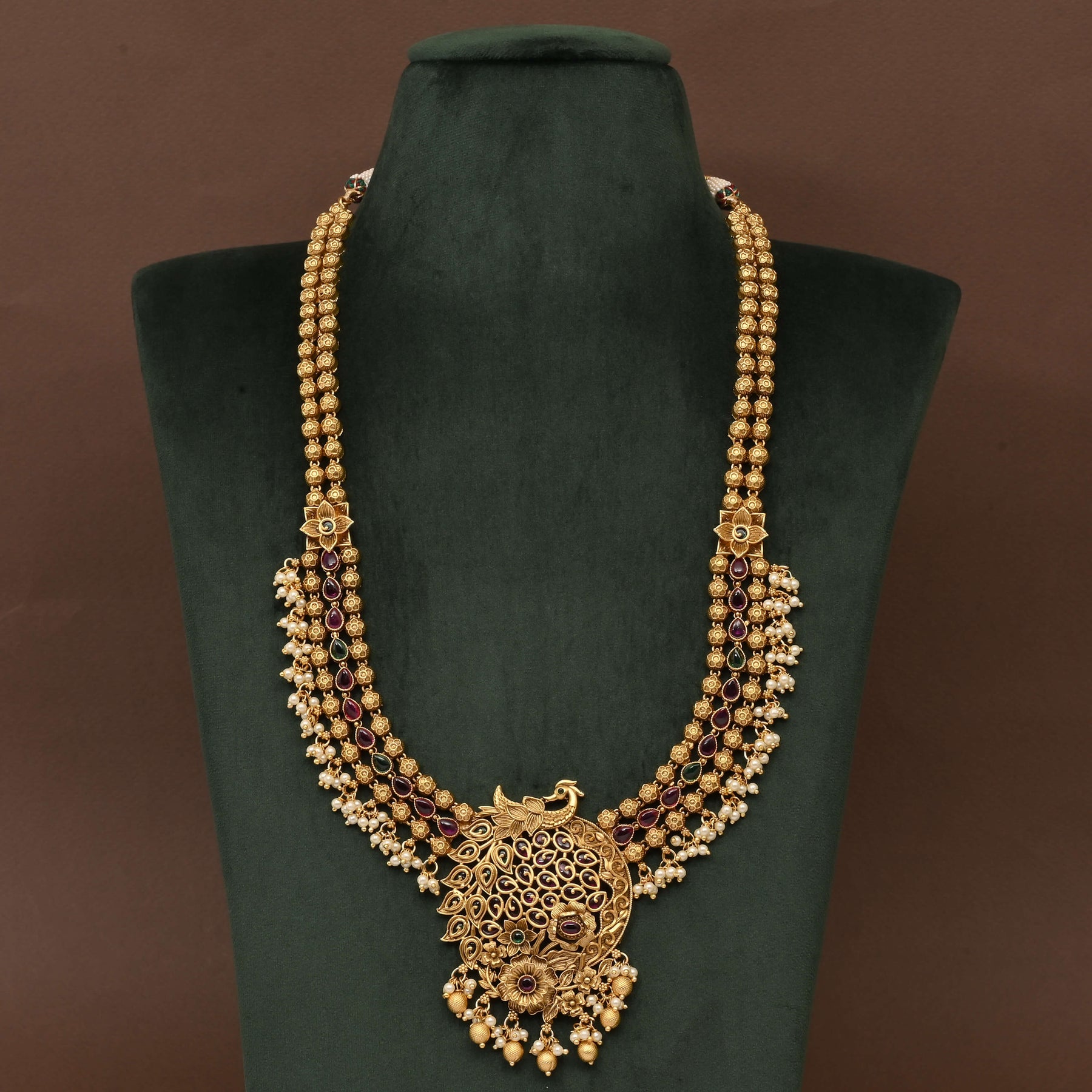 Experience timeless elegance with this handcrafted Temple Necklace Set featuring an exclusive design in a rich gold finish. Crafted to emulate the authentic look of real gold, it offers a traditional appeal perfect for special occasions. The intricate detailing reflects expert craftsmanship, making it a distinguished addition to your jewelry collection.