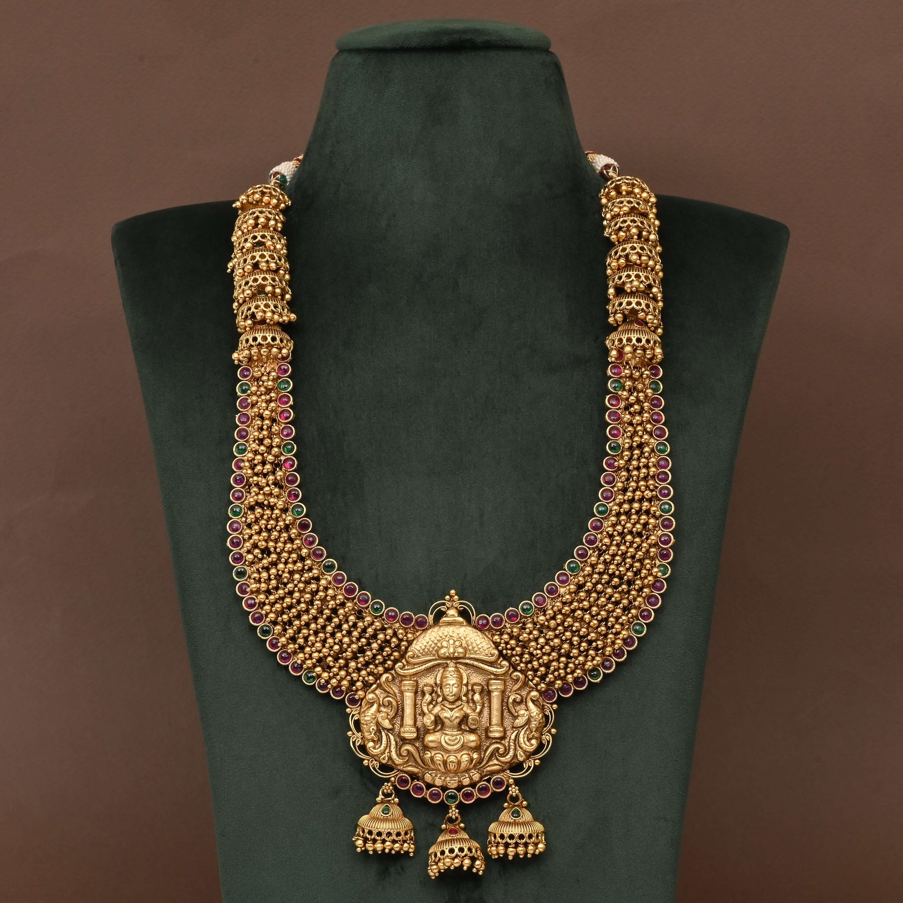 The Temple Necklace Set showcases an exclusive handcrafted design inspired by Goddess Lakshmi, embodying traditional artistry with a realistic gold finish. This piece offers the authentic appearance of real gold while preserving cultural elegance, making it an ideal accessory for ceremonial occasions and classical attire. Its intricate craftsmanship highlights timeless heritage, ensuring a distinguished statement in every wear.