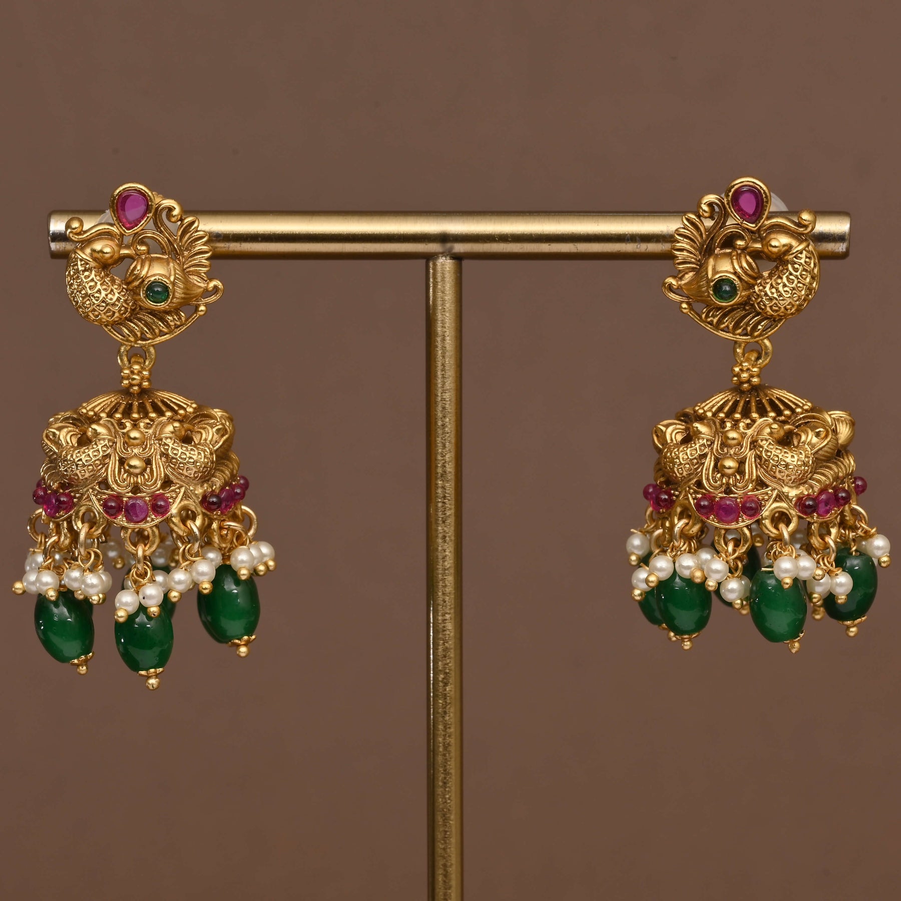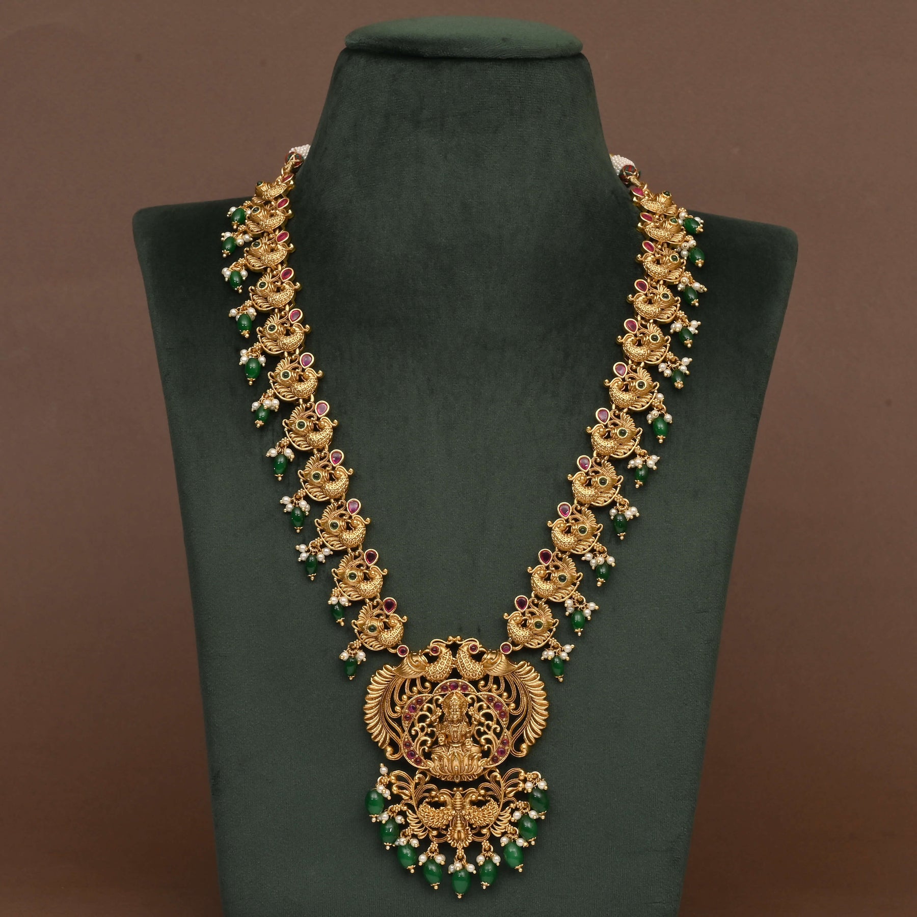 This Temple Necklace Set combines traditional craftsmanship with an exclusive design, finished in a rich gold tone that closely resembles real gold. Handcrafted with meticulous attention to detail, it offers an authentic look that enhances any ethnic or ceremonial outfit. A refined choice for those seeking timeless elegance in temple jewelry.