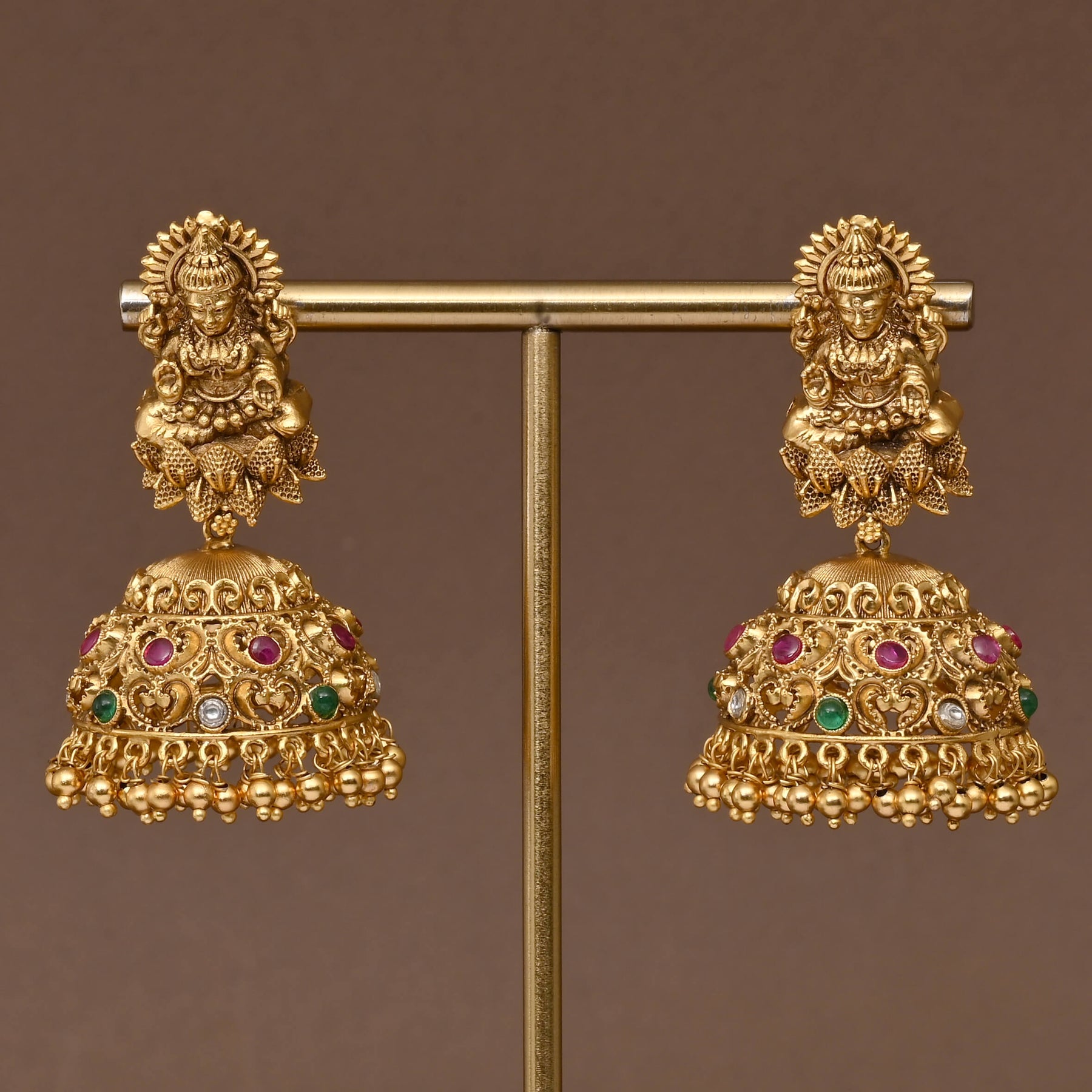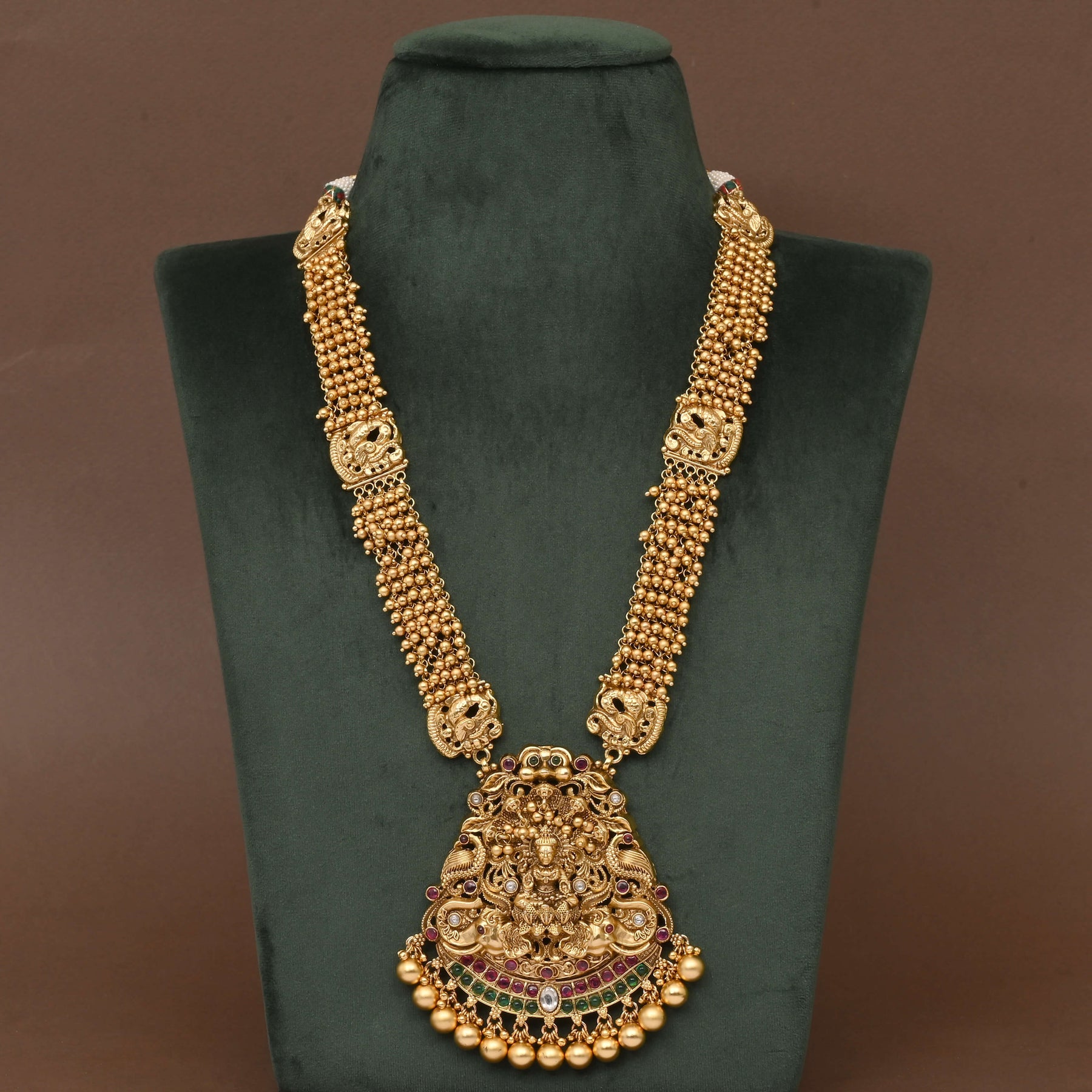 Experience timeless elegance with this Temple Necklace Set featuring a handcrafted design inspired by goddess Lakshmi. Crafted to resemble real gold, this traditional necklace set offers an exclusive look that complements cultural attire beautifully. Perfect for special occasions, it blends intricate artistry with a rich heritage aesthetic.