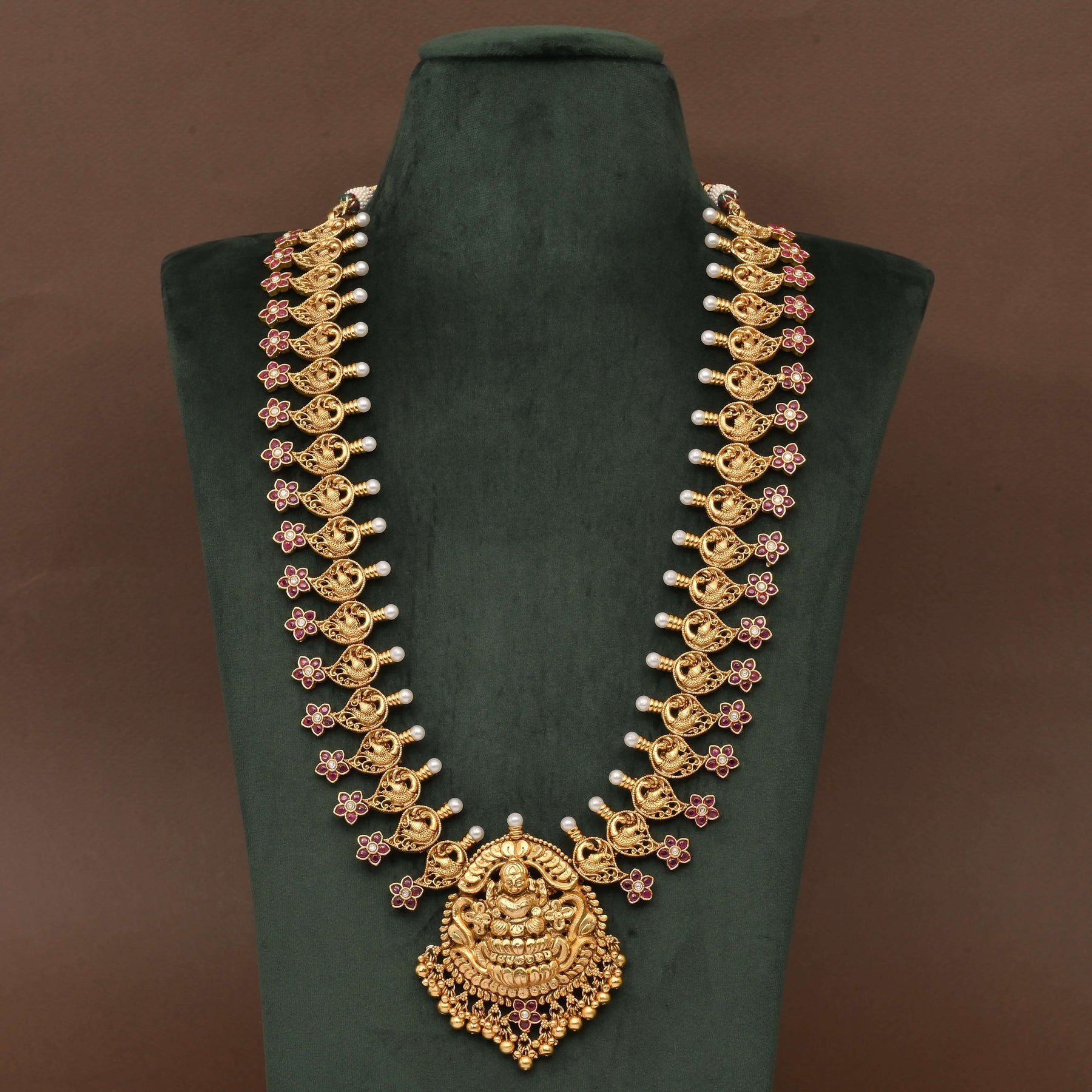 Experience the elegance of tradition with this Temple Necklace Set, featuring an exquisite goddess Lakshmi design. Handcrafted with meticulous attention to detail, the set showcases a rich gold finish that closely resembles real gold, offering timeless appeal. Its exclusive design highlights cultural heritage while enhancing your ensemble with authentic charm and sophistication. Ideal for those who appreciate craftsmanship and classic beauty in their jewelry collection.