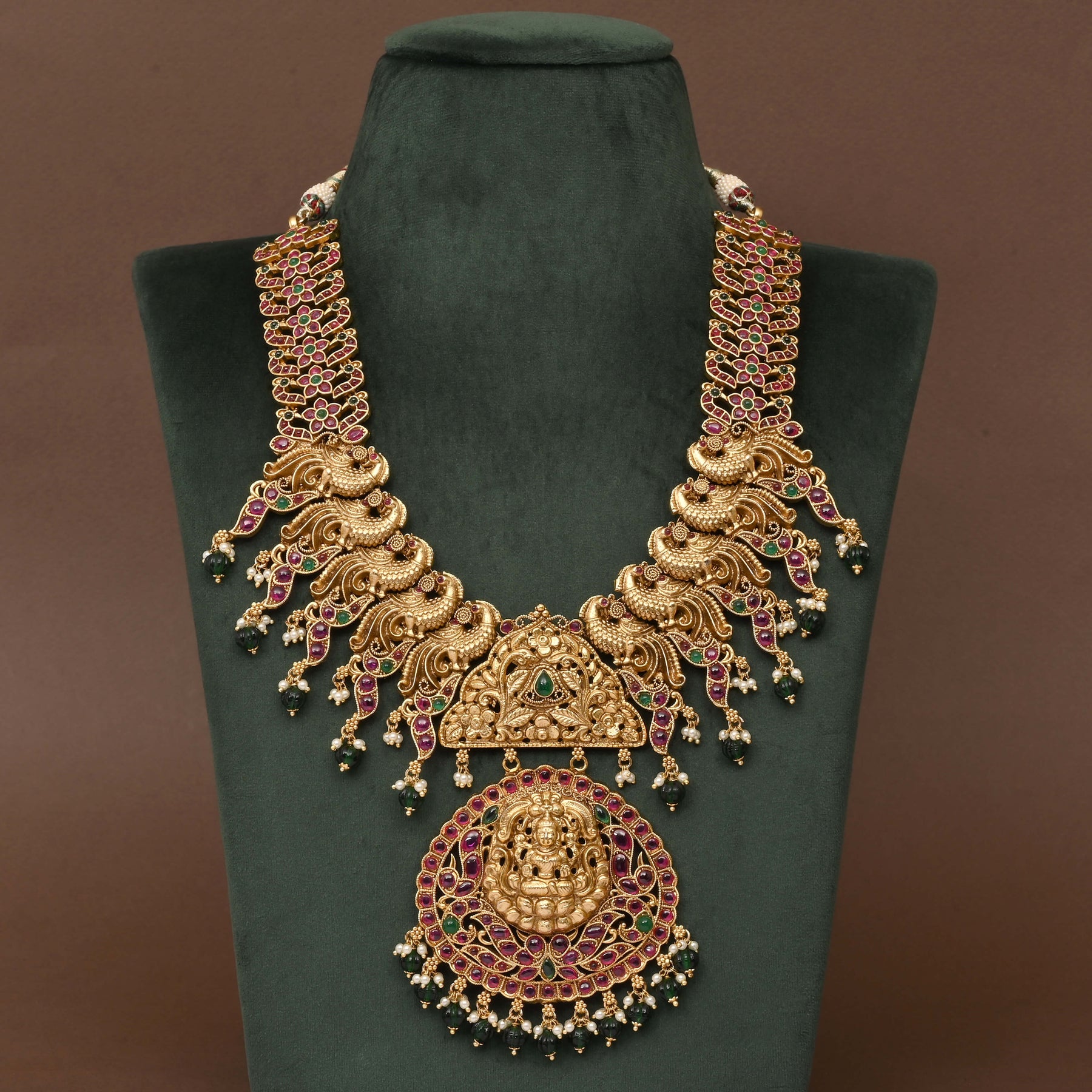 This handcrafted Temple Necklace Set captures the traditional elegance of a goddess Lakshmi design, finished in a rich gold tone that closely mimics real gold. Its exclusive craftsmanship reflects intricate artistry, making it a distinctive addition to classic ethnic wear. Ideal for those seeking authentic style with a luxurious appearance, this set embodies heritage and timeless beauty.