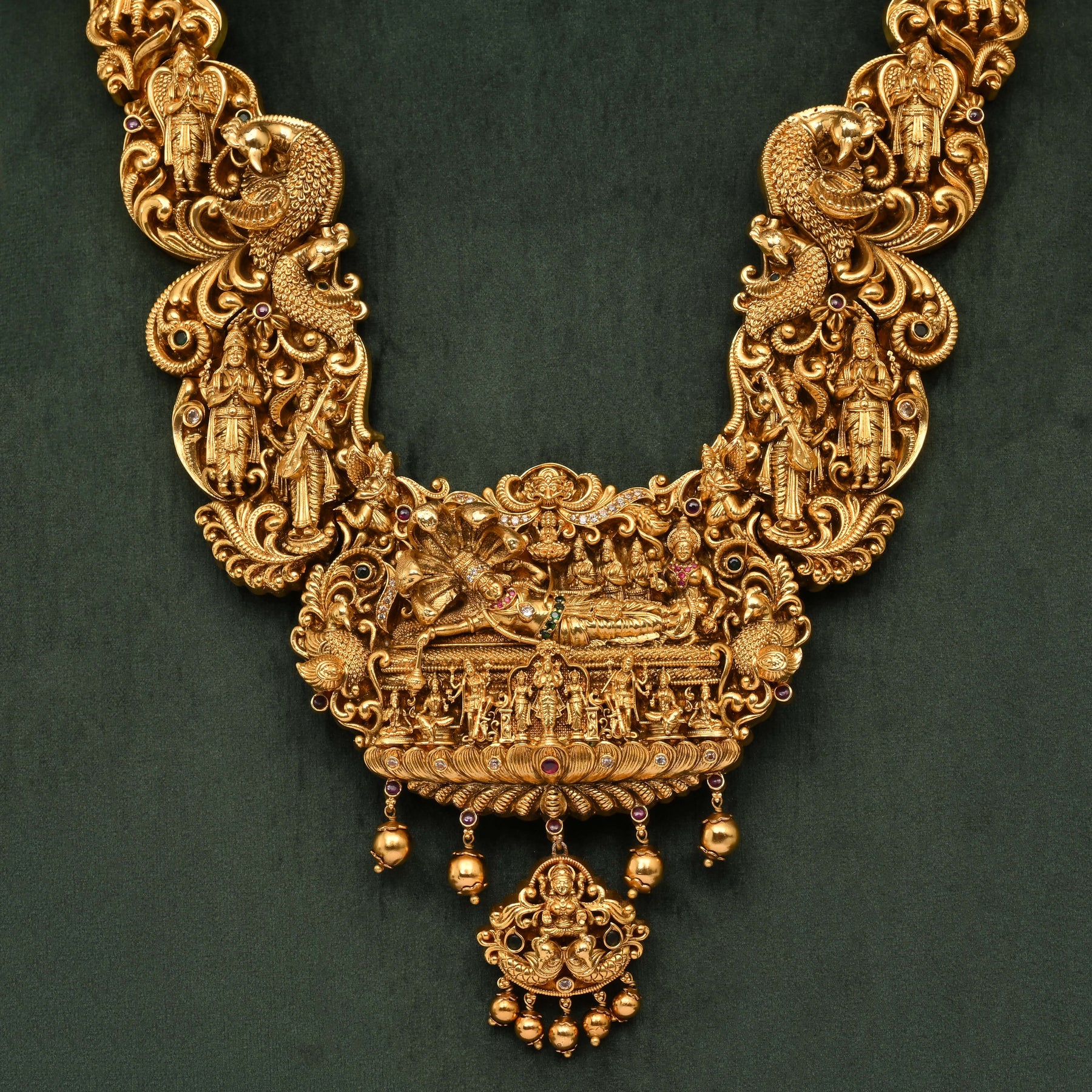 This Temple Necklace Set features an exquisite handcrafted goddess Lakshmi design, finished in a rich gold tone that authentically mimics real gold. Combining traditional artistry with an exclusive design, it offers a timeless appeal perfect for cultural and festive occasions. Meticulously crafted to showcase intricate details, this set enhances elegance while reflecting the spiritual heritage behind its creation.