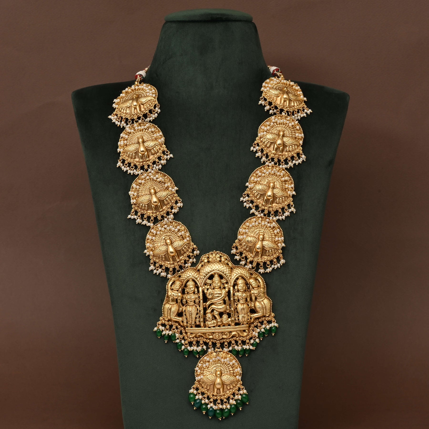 This handcrafted Temple Necklace Set features an exclusive design inspired by Goddess Lakshmi, embodying traditional elegance. Finished in a rich gold tone, it offers the authentic look of real gold, making it a timeless addition to your collection. Perfect for cultural occasions, this necklace set blends heritage artistry with refined craftsmanship.