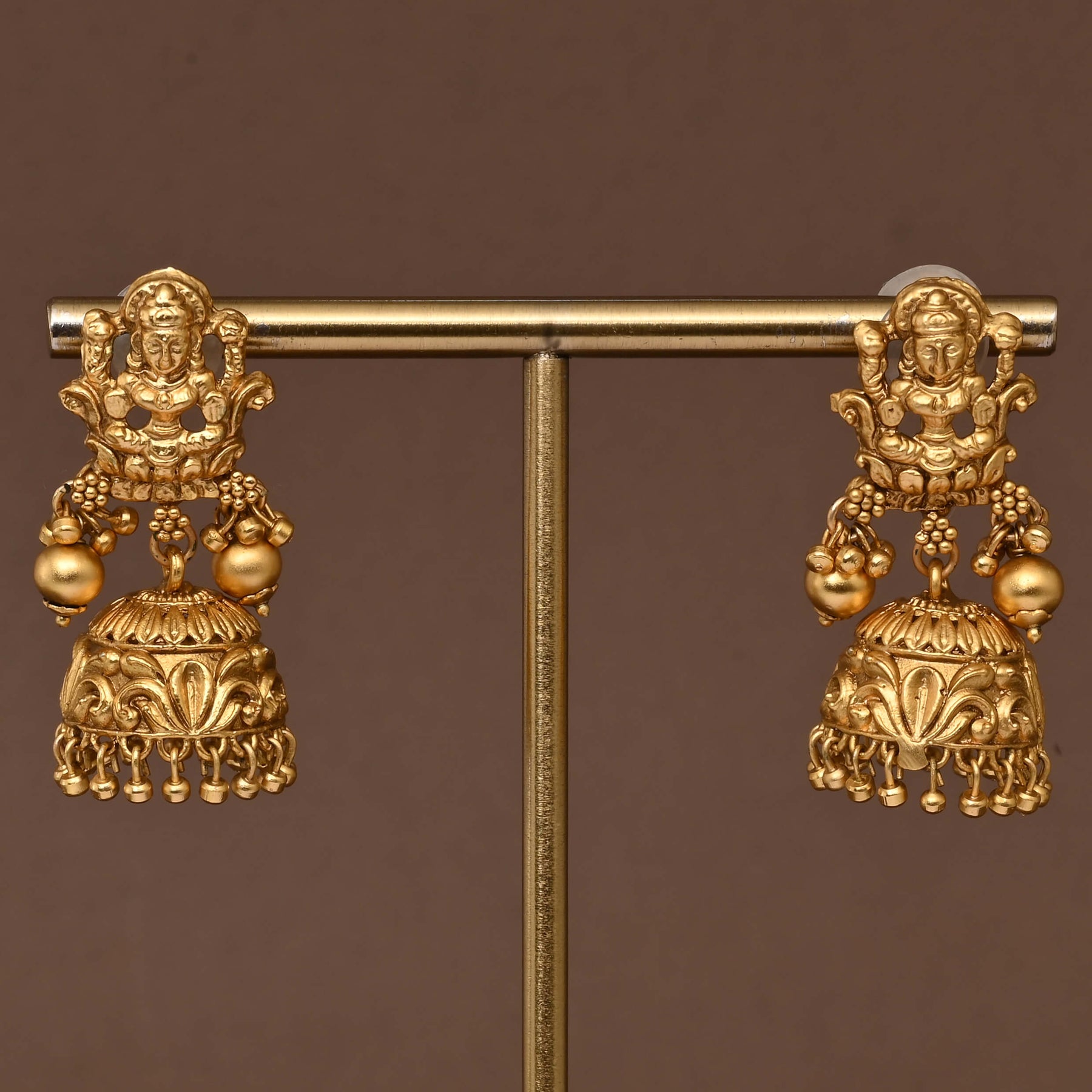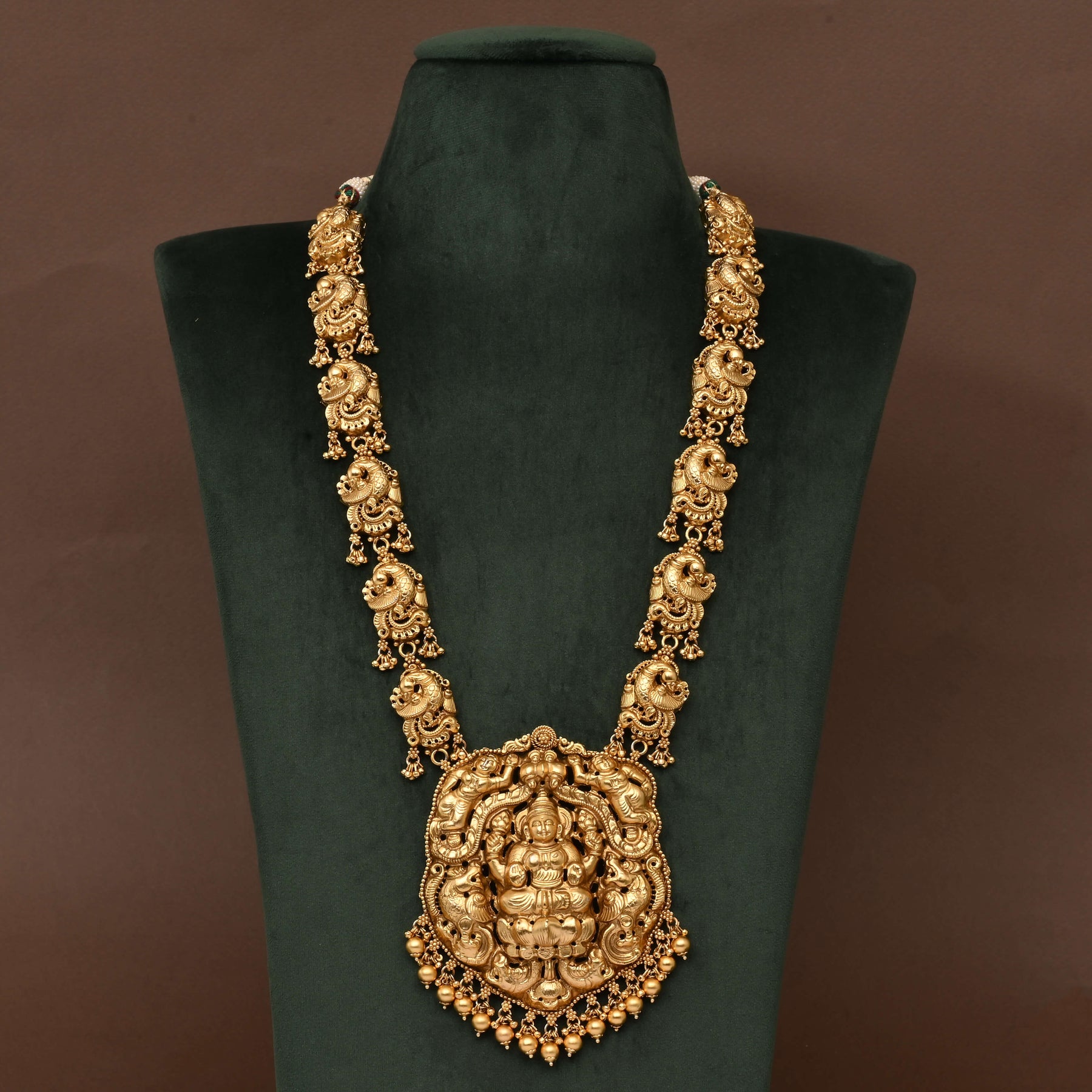 Elevate your traditional attire with this handcrafted Temple Necklace Set, featuring an exclusive design inspired by Goddess Lakshmi. Finished in rich gold tones, it offers the authentic look of real gold while embodying timeless craftsmanship. Perfect for special occasions, this necklace set reflects cultural heritage with intricate detailing and a revered aesthetic.