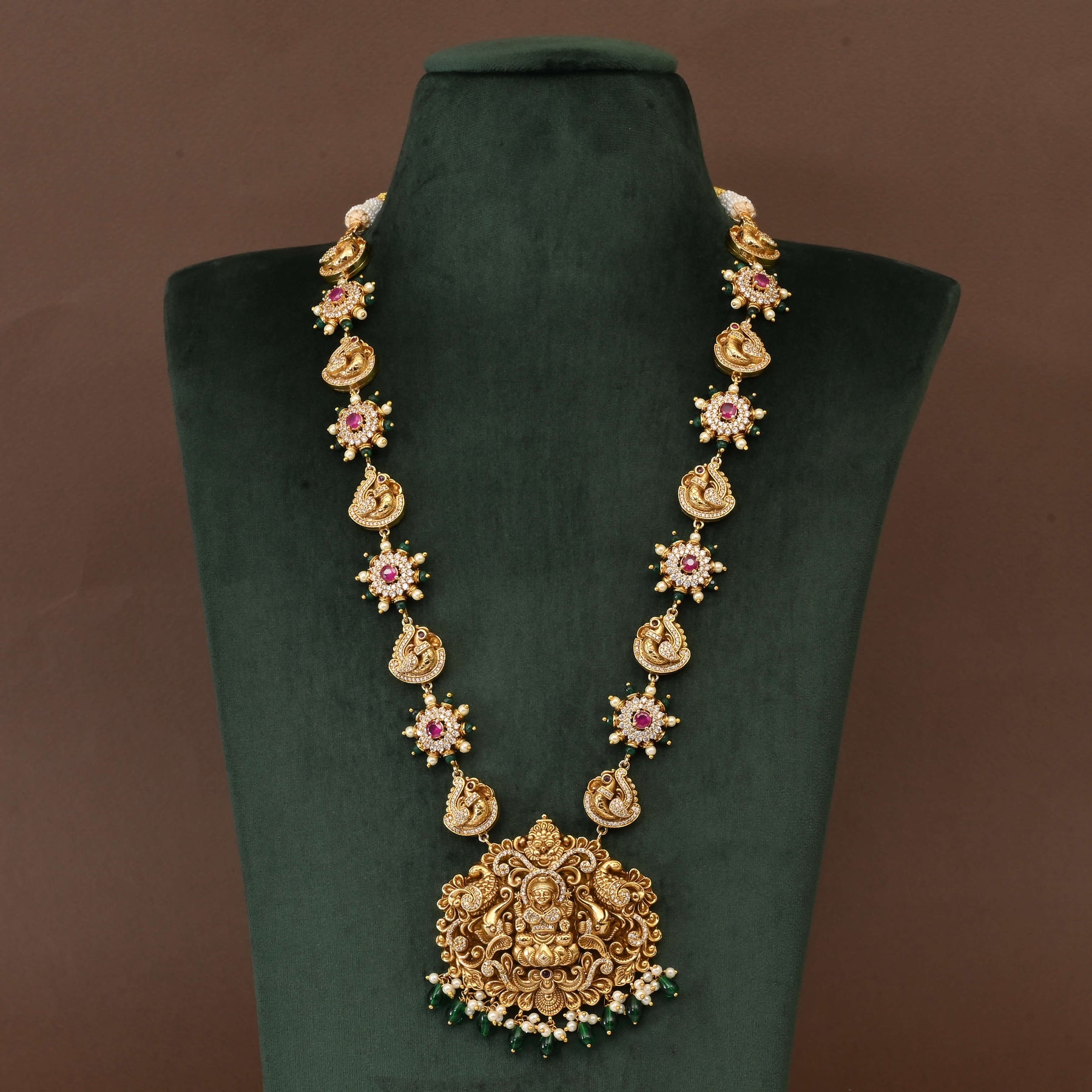 Celebrate timeless tradition with this handcrafted Temple Necklace Set featuring an exclusive goddess Lakshmi design. Finished in a rich gold tone, it offers the authentic look of real gold while embodying cultural heritage. Perfect for special occasions, this intricately crafted piece blends tradition with elegance, making it a distinguished addition to your jewelry collection.