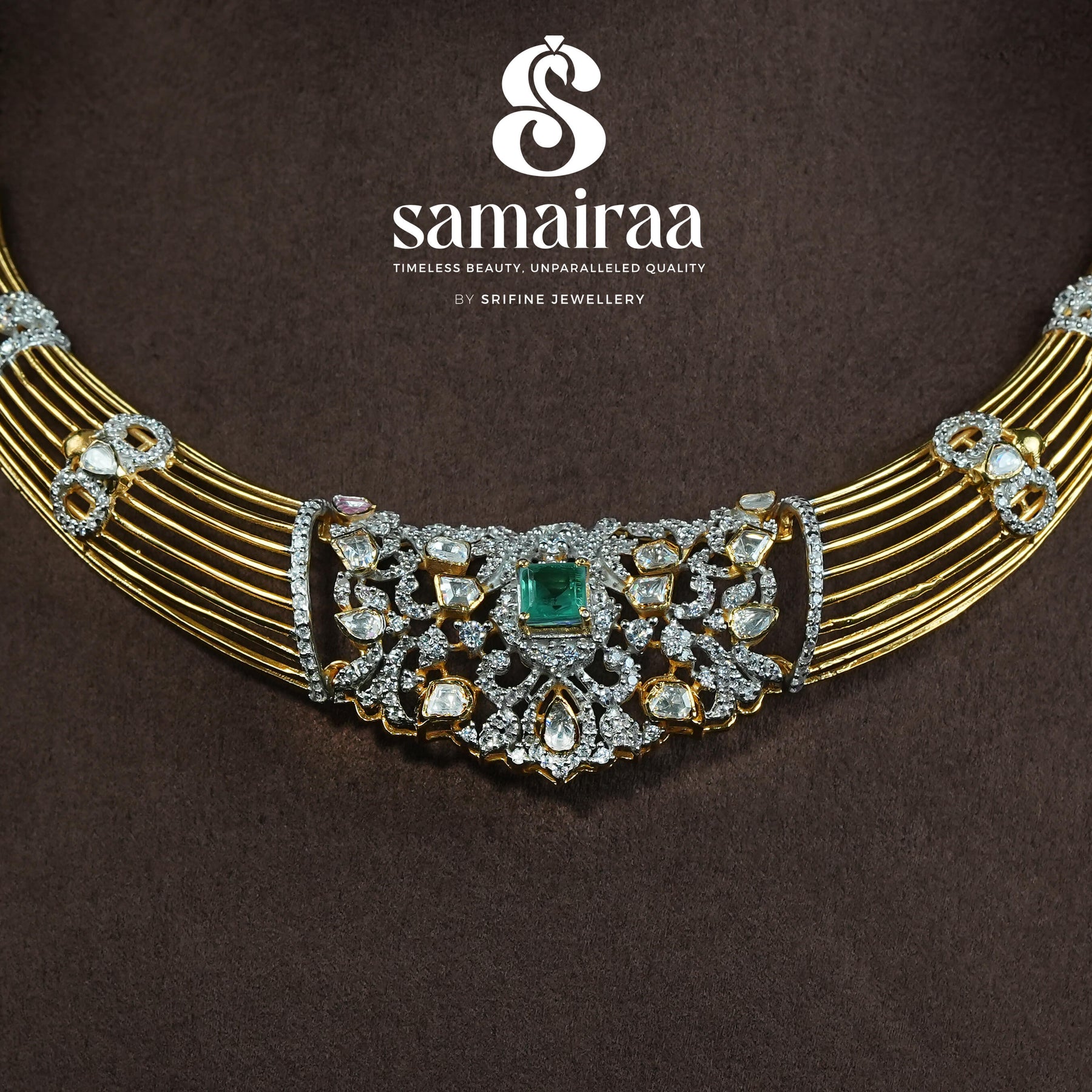 Crafted from 92.5% sterling silver, this Moissanite Hasli Necklace embodies Indian heritage with a traditional, handcrafted design that mimics the elegance of gold. Adorned with sparkling moissanite stones and semi-precious emeralds, each piece is unique, showcasing expert craftsmanship and timeless beauty. Perfect for those seeking a one-of-a-kind accessory that honors classic artistry with a contemporary touch.